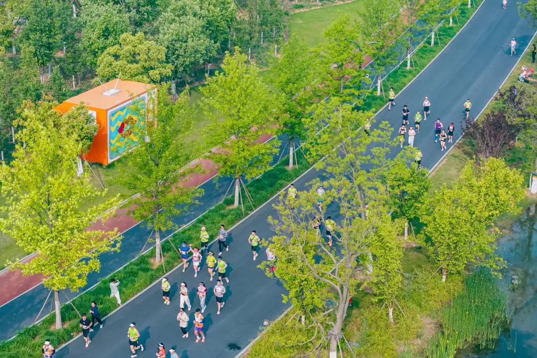 21.0975公里的赛道,是自然与城市的双重叙事。起跑线从“梦想大草坪”延伸,途经全向信标台、航站楼、锦绣湖等。奔跑者在林荫织就的绿绸间穿行,黄山园的奇石、蚌埠园的瓷韵、安庆园的黄梅调渐次铺展。