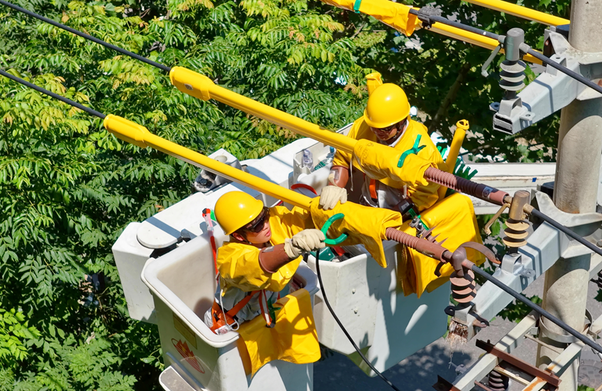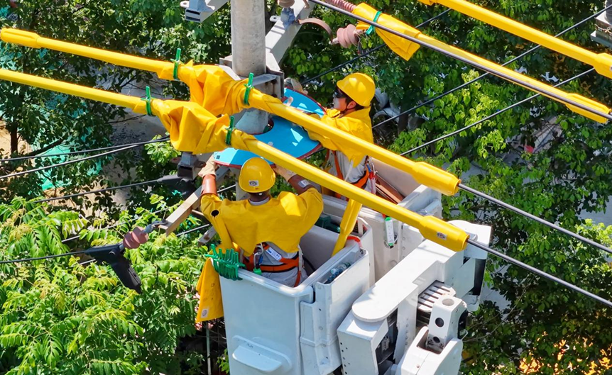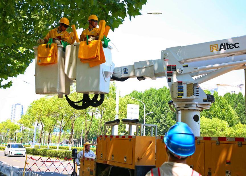 7月3日9时35分,在安徽省合肥市包河区龙川路和北京路交口的110千伏卫塘变电站10千伏龙川路东28线20号电杆处,国网合肥供电公司供电服务指挥中心的5位作业人员正在开展带电作业。
