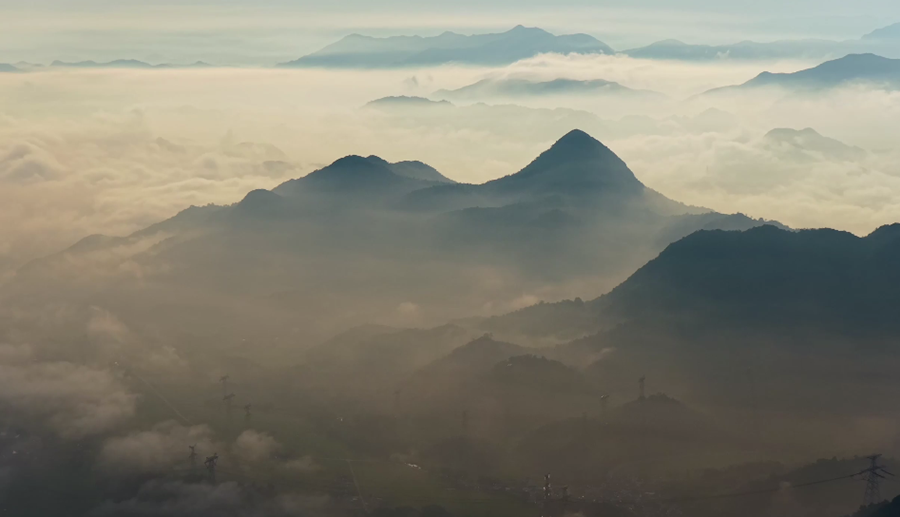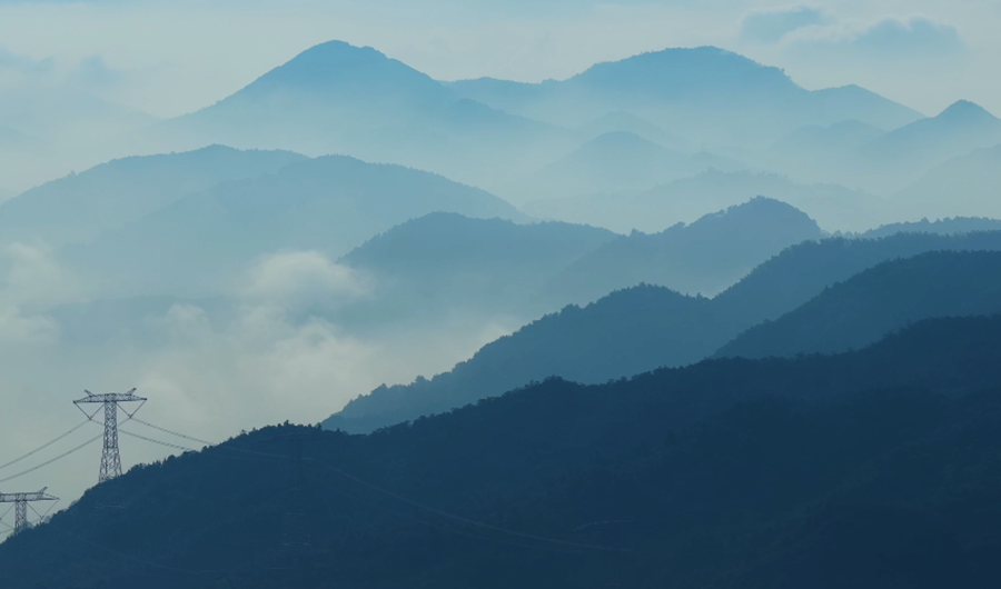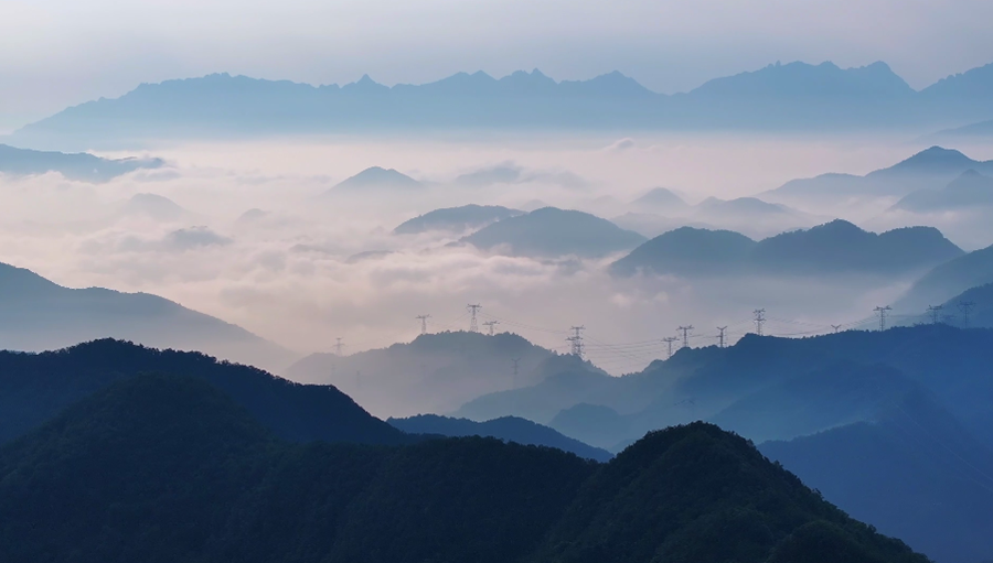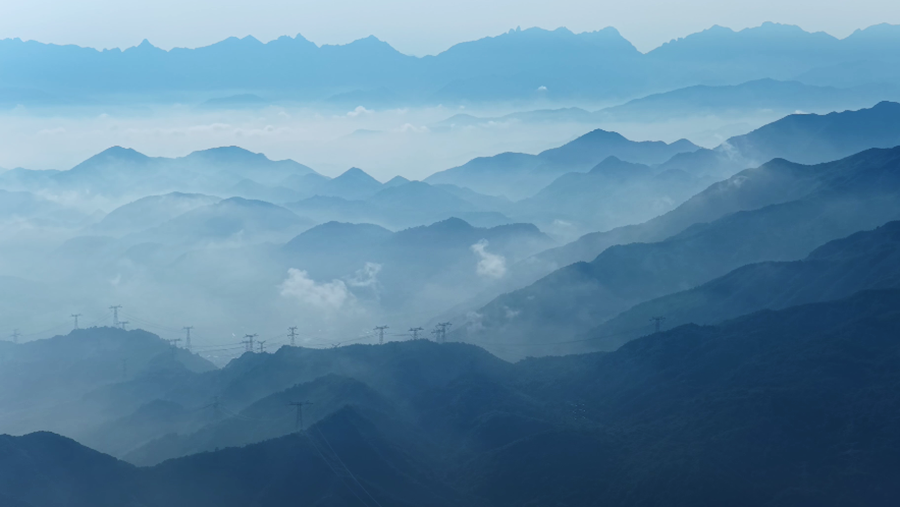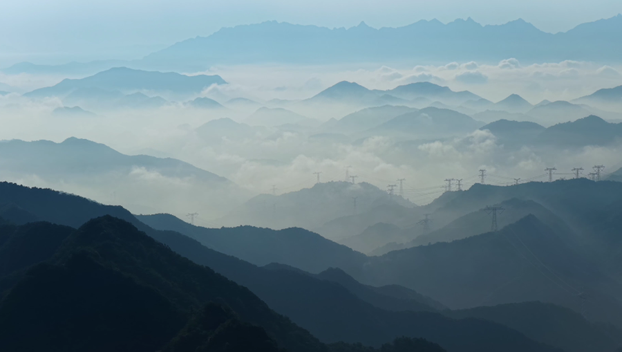 近日,在安徽省池州市贵池区罗城村,薄雾轻抚着乡野大地,远处的山峦、电网在氤氲雾气中若隐若现,与流动的光影相互交织,宛若一幅现实版的千里江山图。(饶治国 何先发)