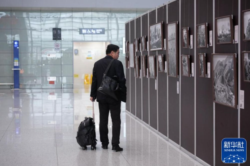 展览设在机场航站楼出发大厅旁侧主题展区,一幅幅影像是一段段记录抗战历史的实证,将参观者带回到烽火连天的抗战岁月。