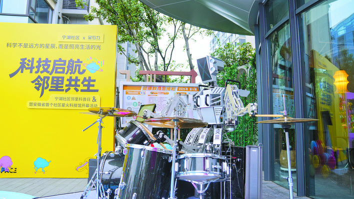金色秋阳下,架子鼓机器人挥动机械臂,有节奏地敲击出乐章。孩子们跟随鼓点跳舞,人头攒动,挤满了宁湖社区“星石力科学文化空间”的门口。