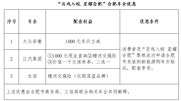 为配合“百戏入皖 星耀合肥”活动深入开展,进一步推动戏曲票根后市场发展,经合肥市商务、工信等部门与合肥地产车企积极沟通,在原有票根购买新能源汽车补贴基础上,地产车企推出凭票根购买新能源汽车进一步优惠,具体如下: