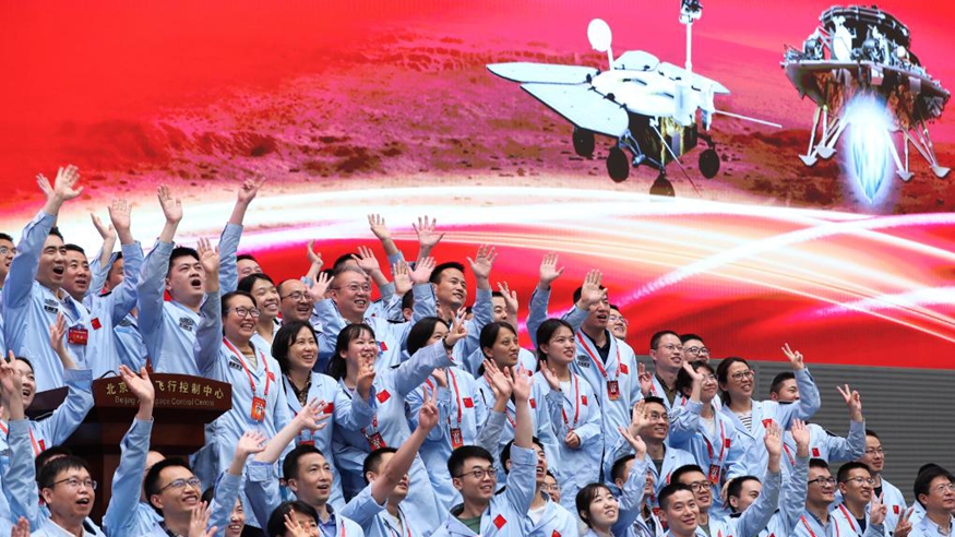 北京航天飞行控制中心青年科技人才群体庆祝我国首次火星探测任务着陆火星成功(2021年5月15日摄)。新华社记者 金立旺 摄