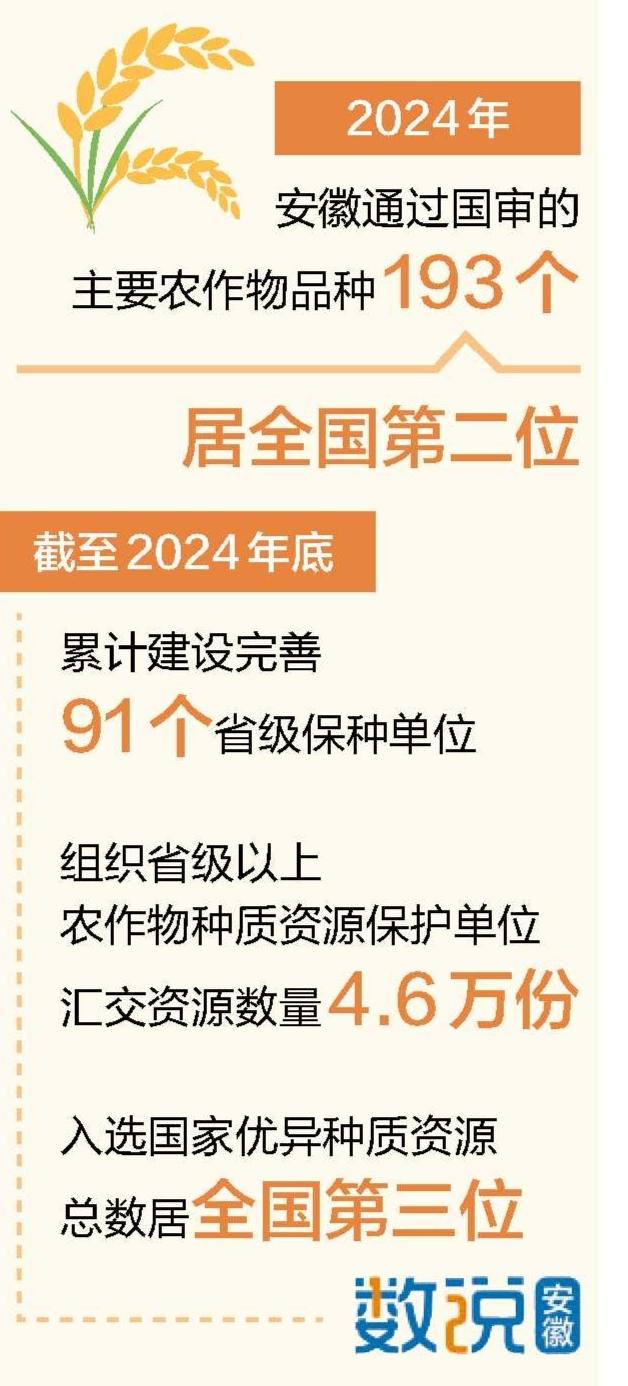 种业是农业发展的命脉,近年来,我省建设完善资源保存共享体系,让种子和遗传资源得到有效保护和高效使用。同时聚焦粮食安全、单产提升等重要行动的品种需求。2024年,安徽通过国审的主要农作物品种193个,居全国第二位;累计建设完善91个省级保种单位,并组织省级以上农作物种质资源保护单位汇交资源数量4.6万份,入选国家优异种质资源总数居全国第三位。