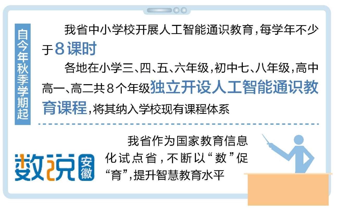 日前,省教育厅印发了《安徽省中小学人工智能通识教育课程纲要(2025年版)》,明确自2025年秋季学期起,我省中小学校开展人工智能通识教育,每学年不少于8课时。具体安排为各地在小学三、四、五、六年级,初中七、八年级,高中高一、高二共8个年级独立开设人工智能通识教育课程,将其纳入学校现有课程体系。
