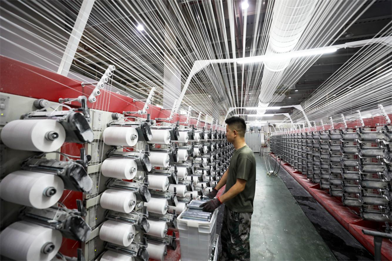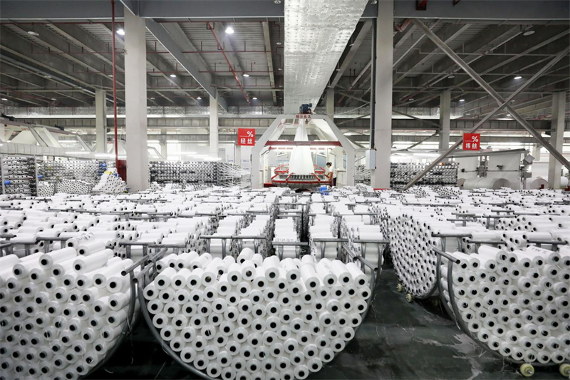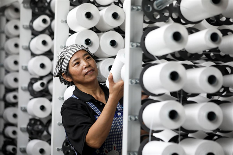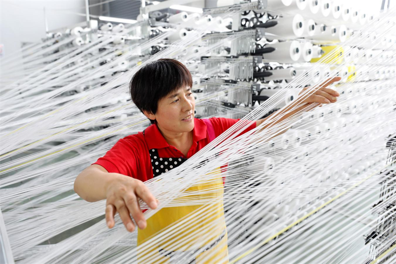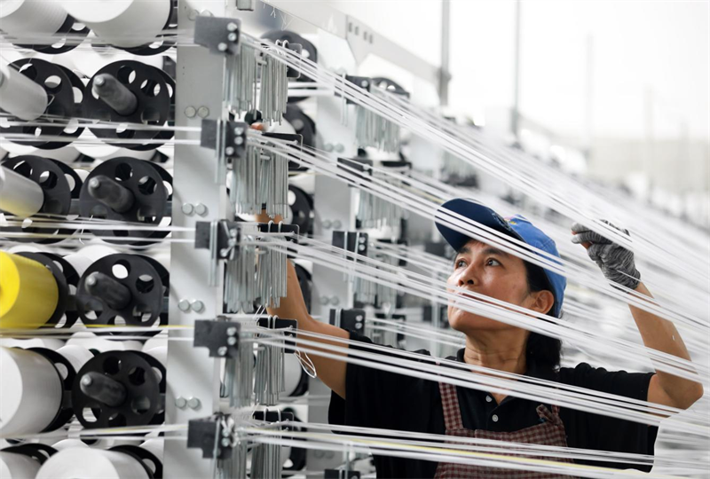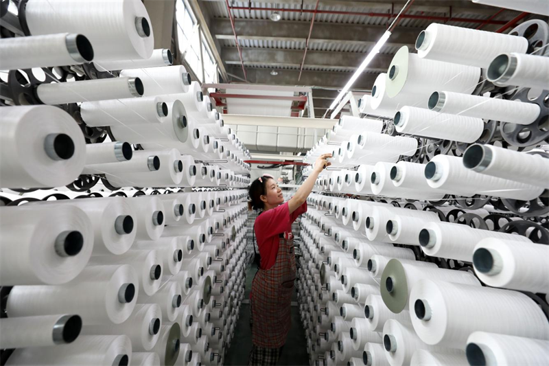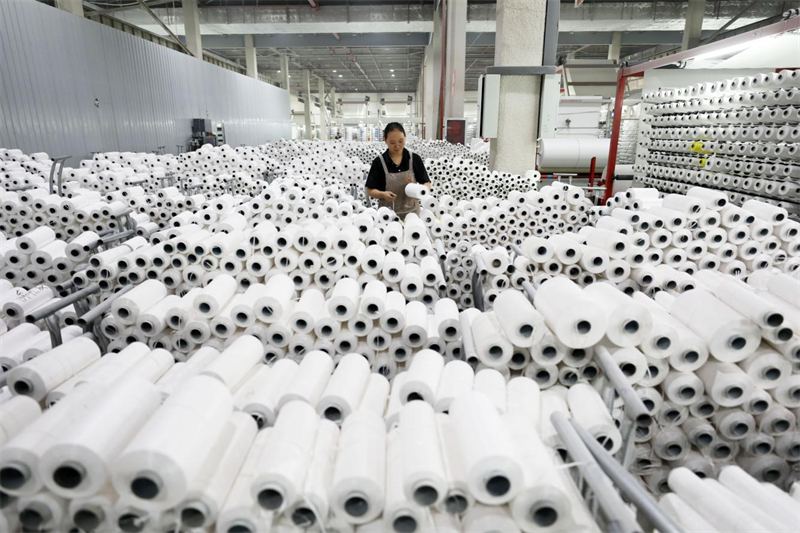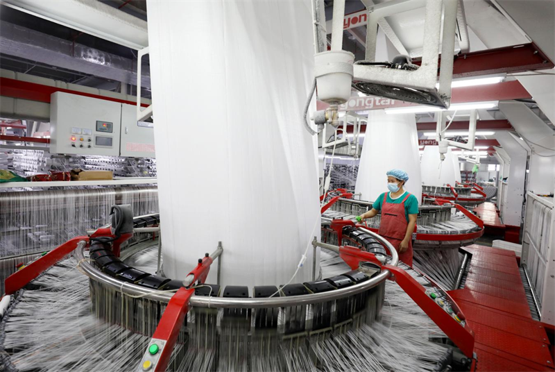 10月8日,安徽省淮北市濉溪经济开发区一家企业生产车间内,聚丙烯基布生产线全速运转,工人正在赶制订单产品。