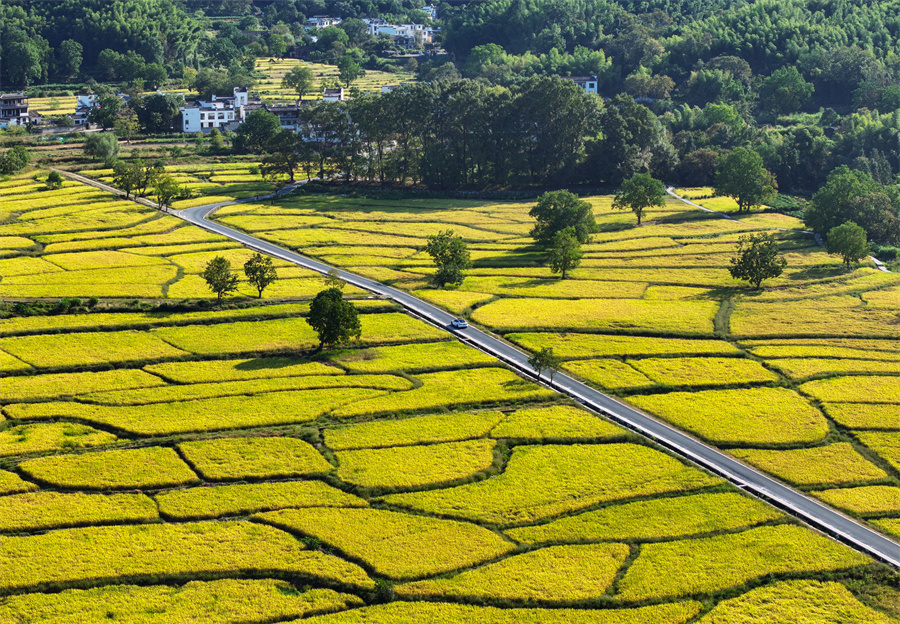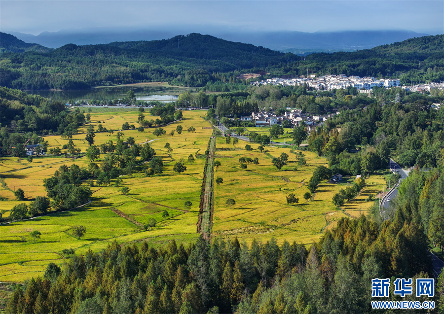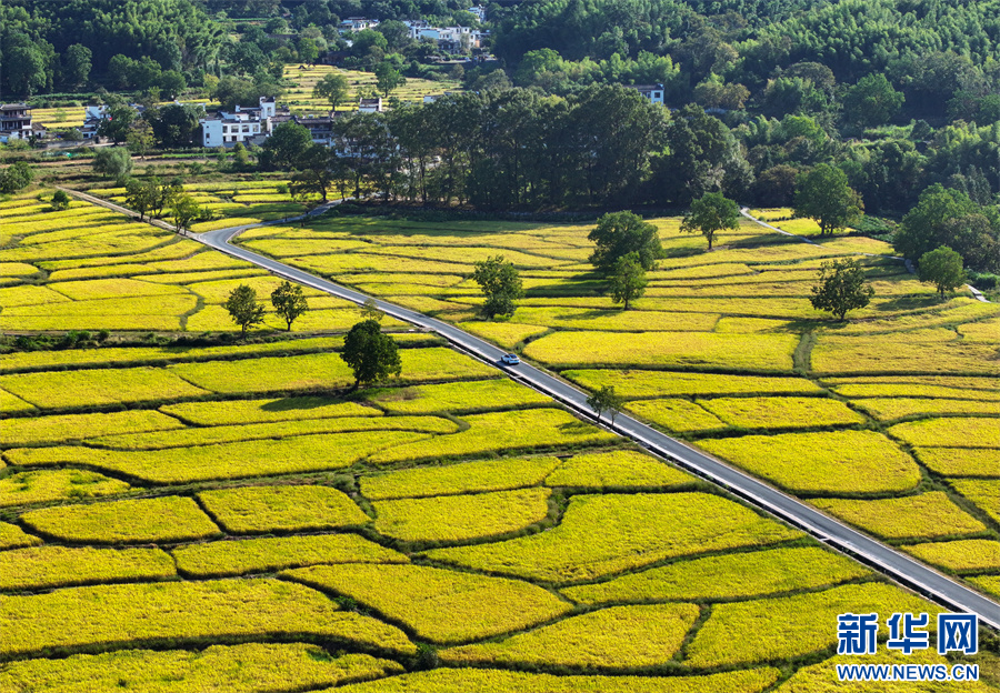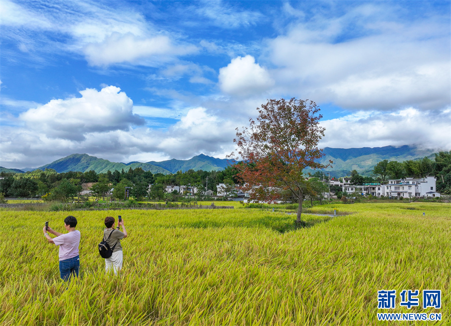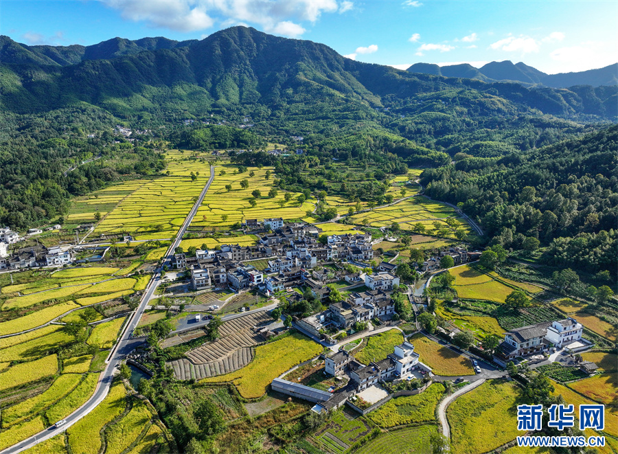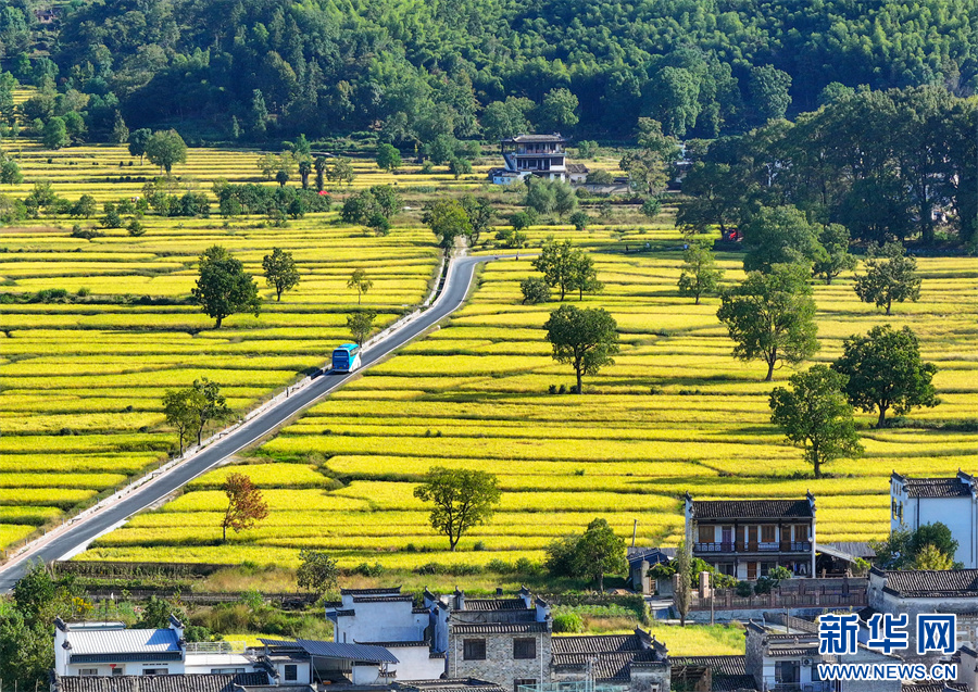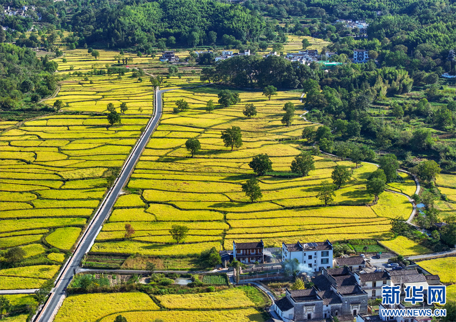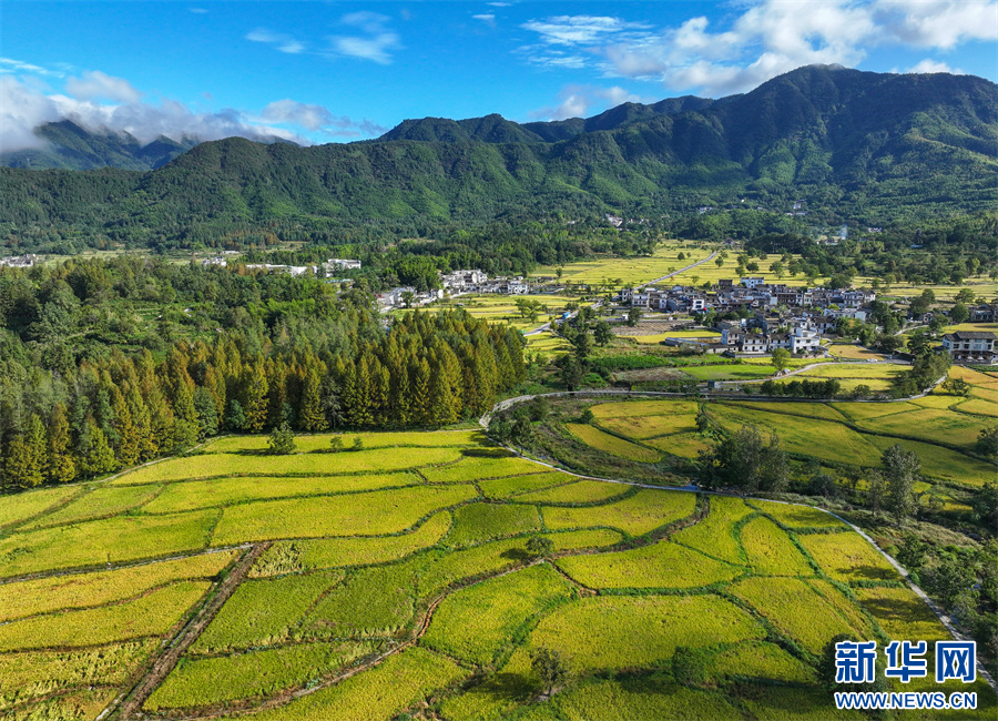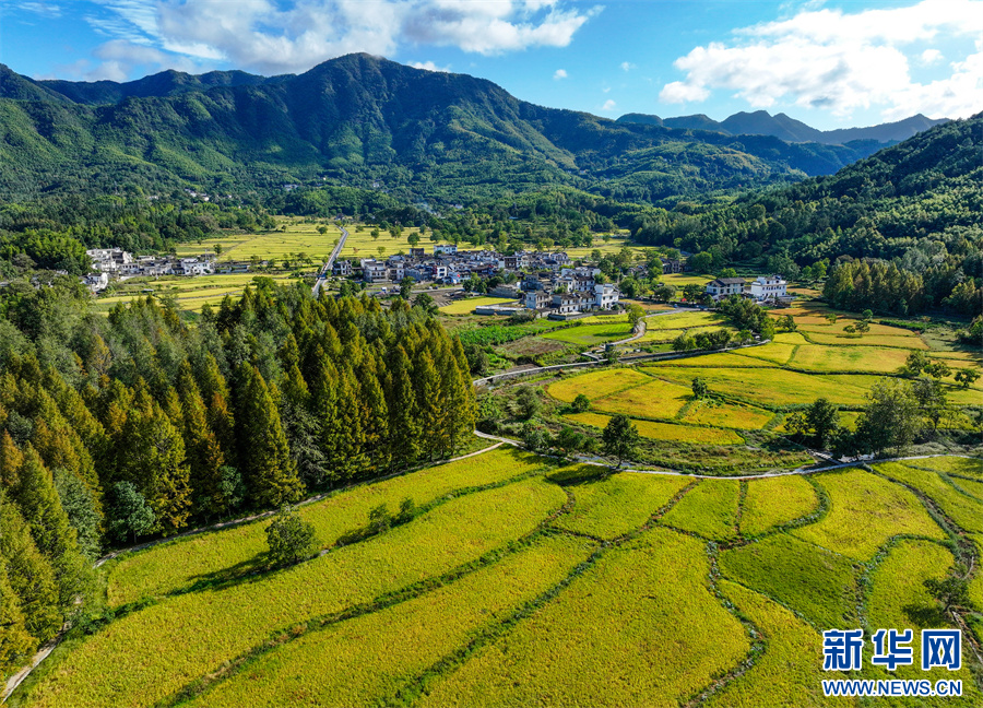 金秋时节,安徽省黄山市黟县宏村镇塔川国家森林公园内稻浪翻滚,金黄稻田与粉墙黛瓦构成一幅丰收与古韵交织的秋日画卷。新华网发(施亚磊 摄)