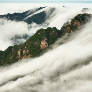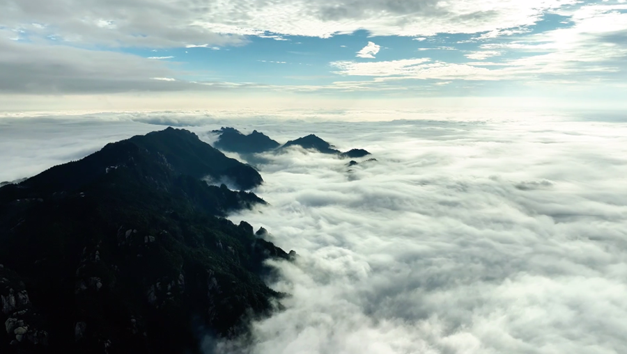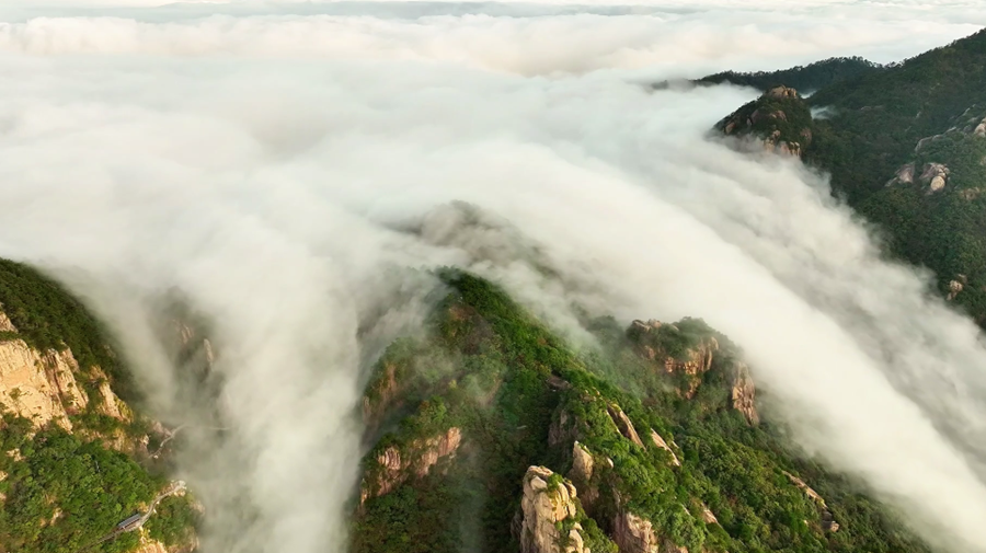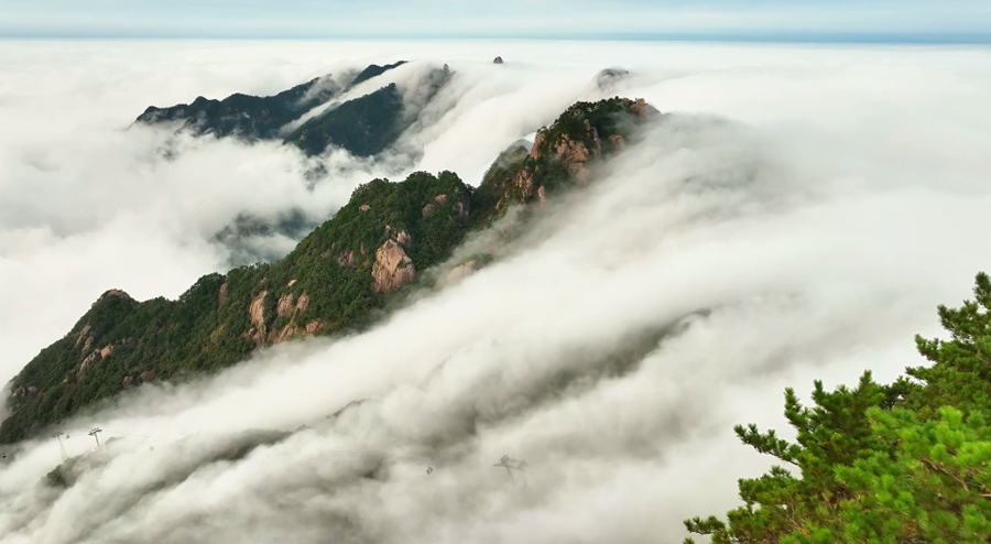 近日,安徽池州九华山风景区迎来壮观云海景观。磅礴云瀑自山巅倾泻而下,时而如浪涛奔涌,时而若轻纱曼舞,将峰峦笼罩其中,若隐若现,宛如一幅动态水墨丹青画卷。(饶治国、方皓宇)