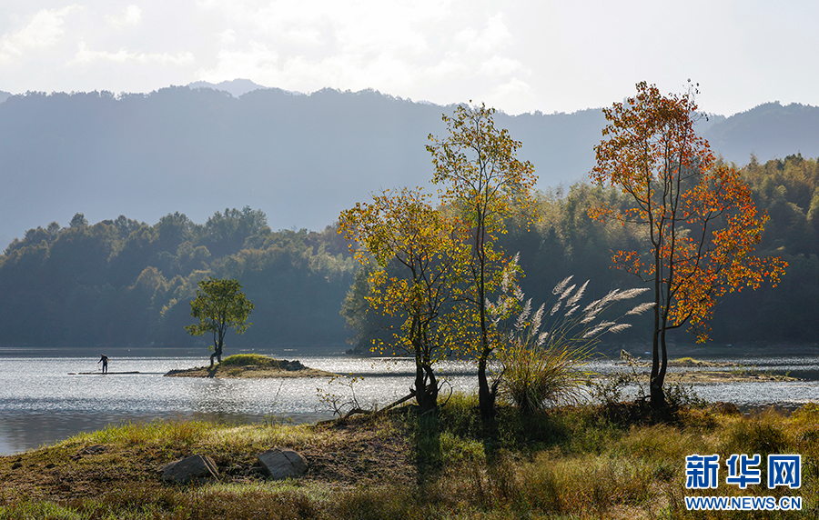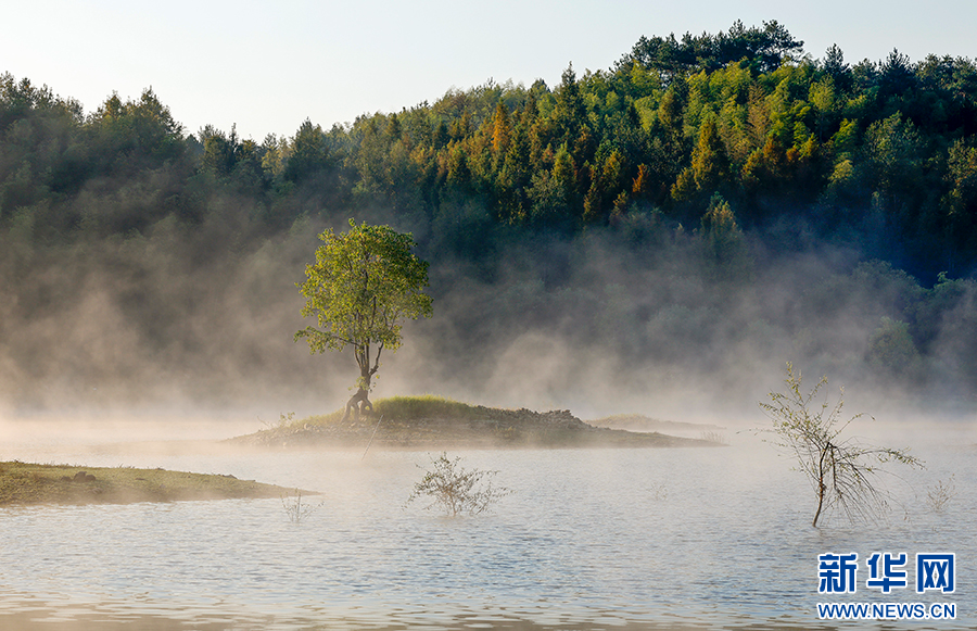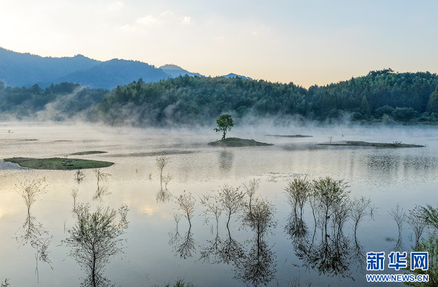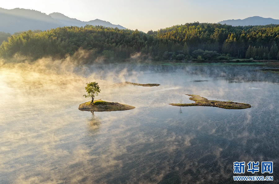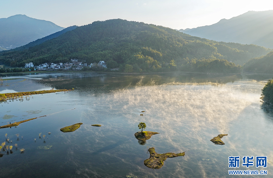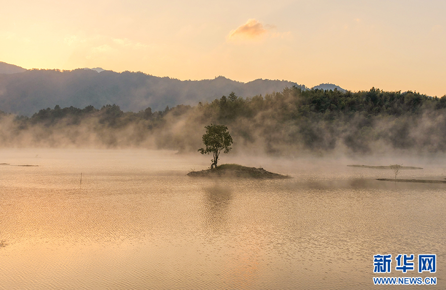 当日是霜降节气,安徽省黄山市黟县奇墅湖上晨雾弥漫,金色的霞光洒在湖面,熠熠生辉,引人入胜。新华网发(施亚磊 摄)