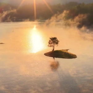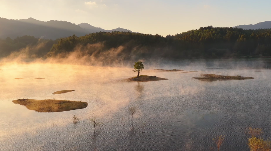 近日,安徽省黟县奇墅湖晨雾弥漫,金色的霞光洒在湖面上,熠熠生辉,宛若诗意画卷。(施亚磊)