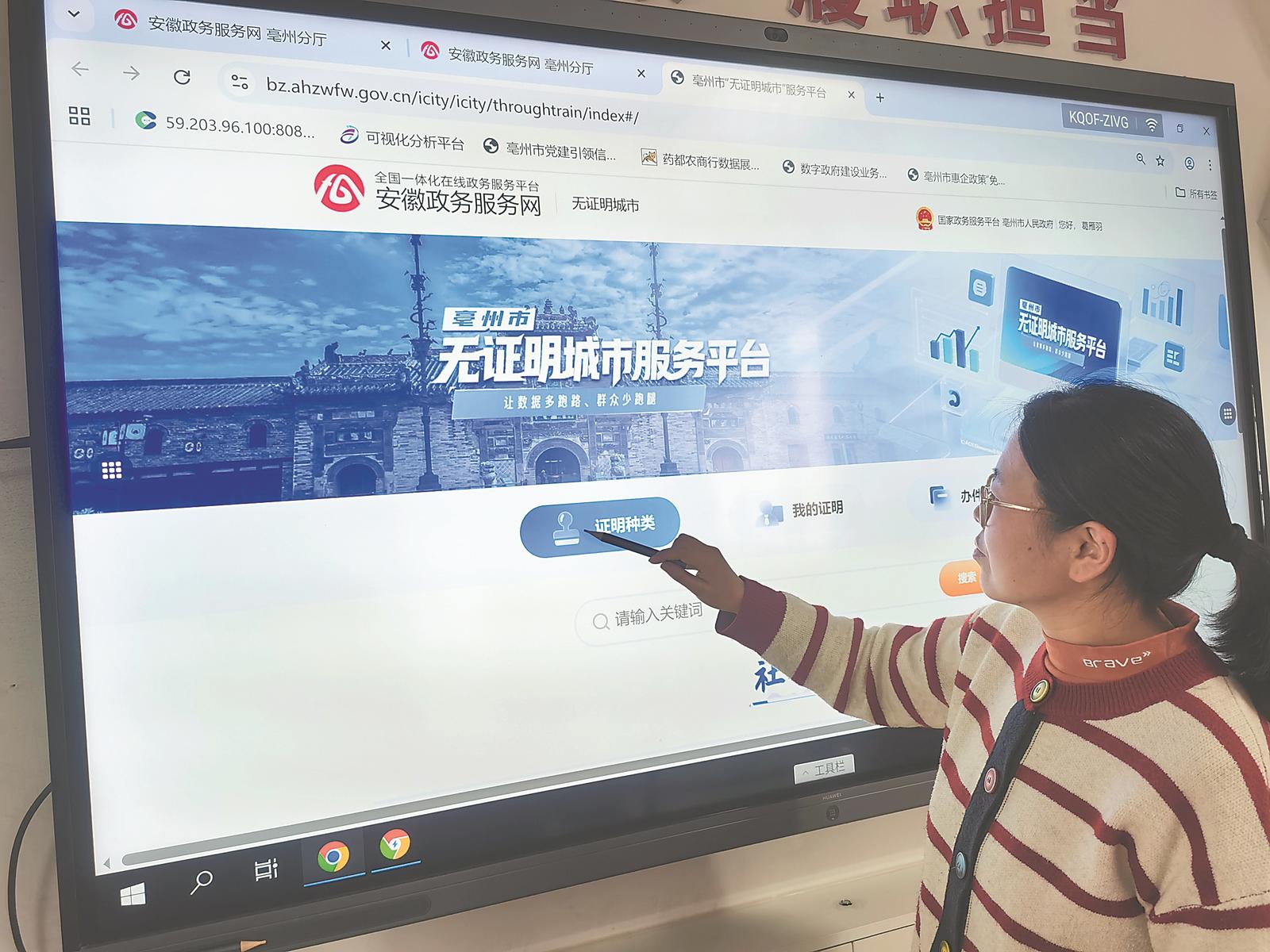 2025年安徽省政府工作报告提出“全面推进‘无证明城市’建设”。亳州聚焦企业和群众反映强烈的“证明材料多、奇葩证明多、重复证明烦”等问题,在“减证便民”工作的基础上,创新搭建“无证明城市”服务平台,推动数据跑起来、部门转起来、服务快起来,实现从“减证便民”向“无证利民”转变。