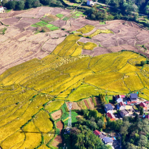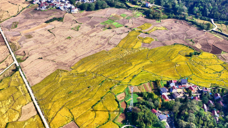 深秋时节,安徽省铜陵市钟鸣镇泉栏村天宇澄明,景致如画。山野之间,鎏金稻田与收割后的几何田块交织错落,同白墙黛瓦的徽派建筑相互映衬,共同勾勒出一幅诗意盎然的乡村画卷。