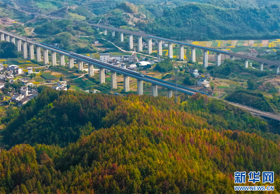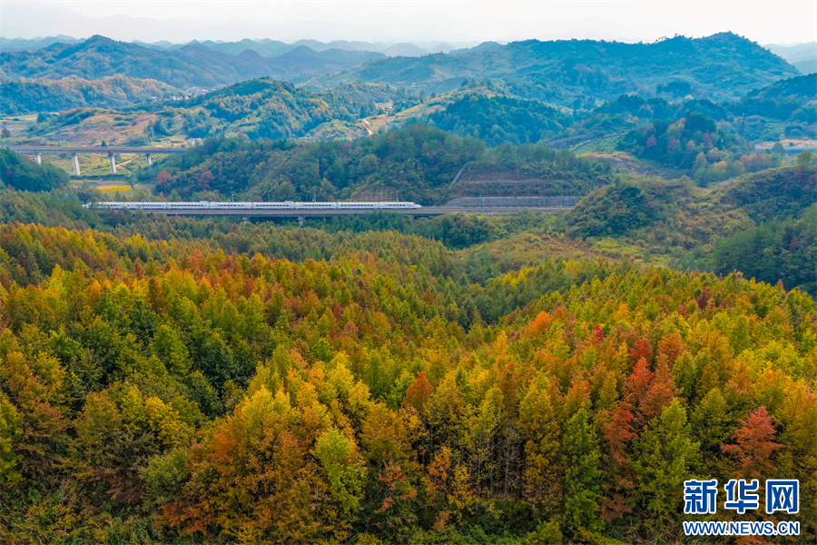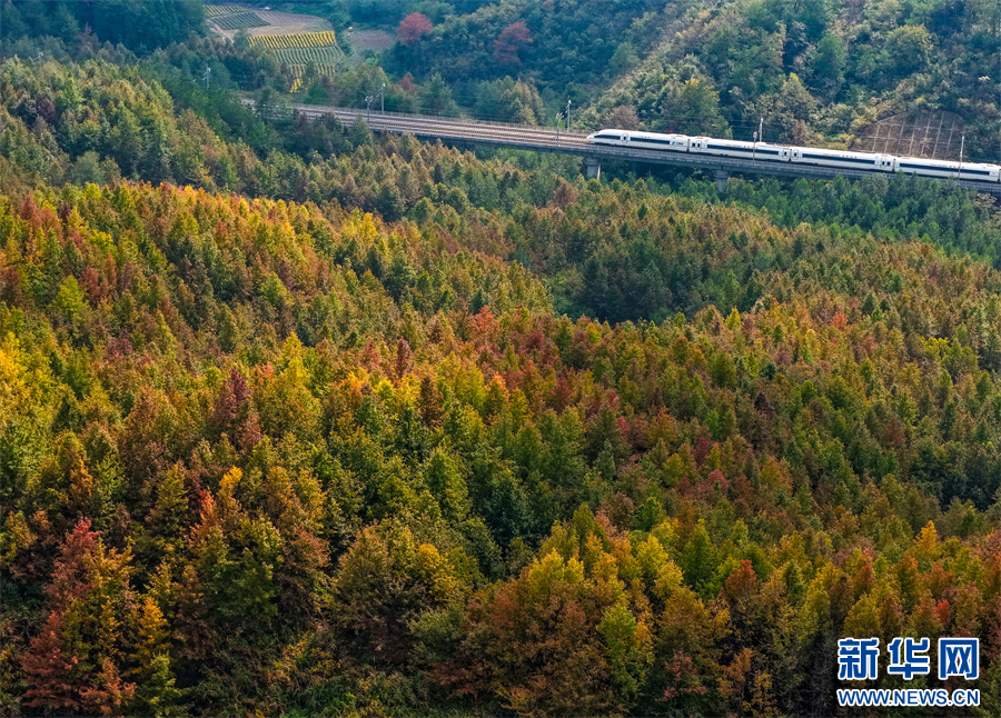 10月28日,列车从安徽省黄山市歙县溪头镇桃源村的斑斓秋色中驶过(无人机照片)。