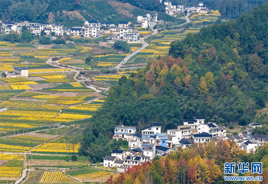 当日,安徽省黄山市歙县溪头镇桃源村秋色缤纷,层林尽染的山峦、盛放的菊花与徽派村落相映成趣,疾驰的列车如同一道流动的风景线,共同构成一幅色彩浓郁、诗意盎然的乡村秋景图。新华网发(施亚磊 摄)