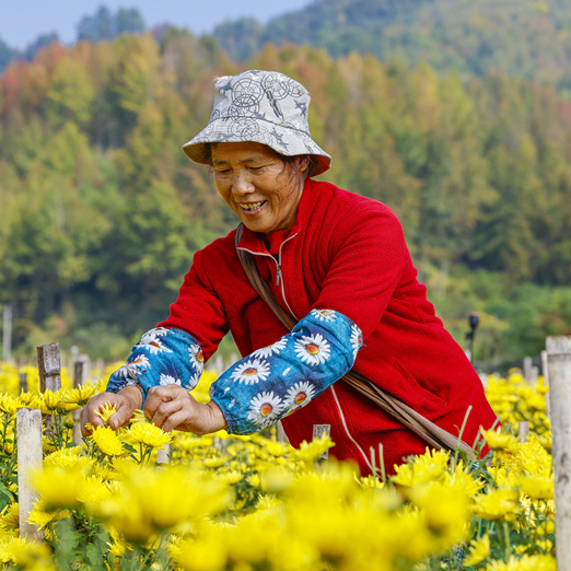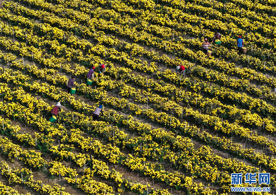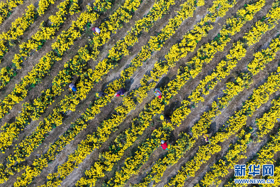 金秋时节,安徽省黄山市歙县溪头镇千亩金丝皇菊陆续进入采摘期,农民趁着晴好天气采摘菊花。