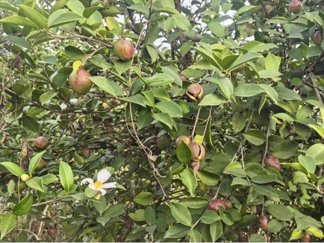 深秋时节,走进舒城县城关镇杨家村,饱满的油茶果、洁白的油茶花,挂满油茶树,压弯了枝柯。茶果变红,茶花盛开,该村油茶今年又迎来丰产。