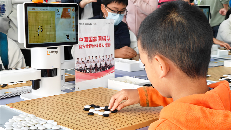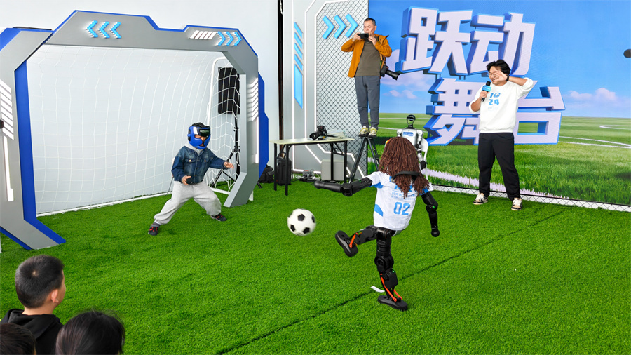 小朋友与机器人比拼球技。(廖宇翔 摄)