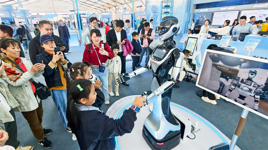 小朋友和智能AI机器人互动。(廖宇翔 摄)