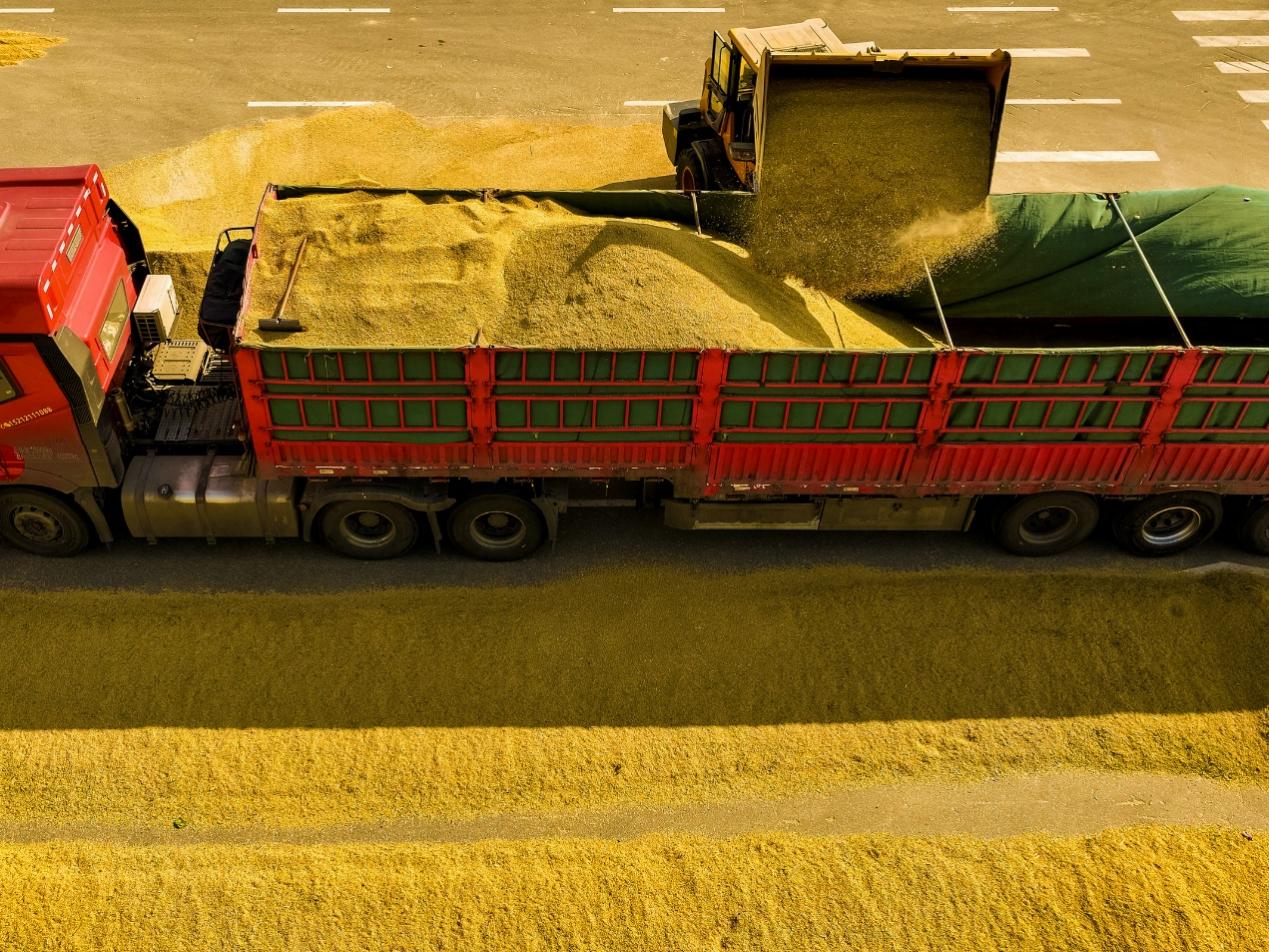 近日,马鞍山市和县历阳镇,当地粮食承包大户抢抓晴好天气,组织人力机械将晾晒的水稻集中装车入库。