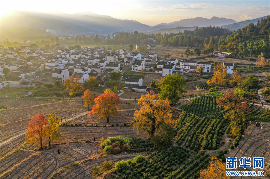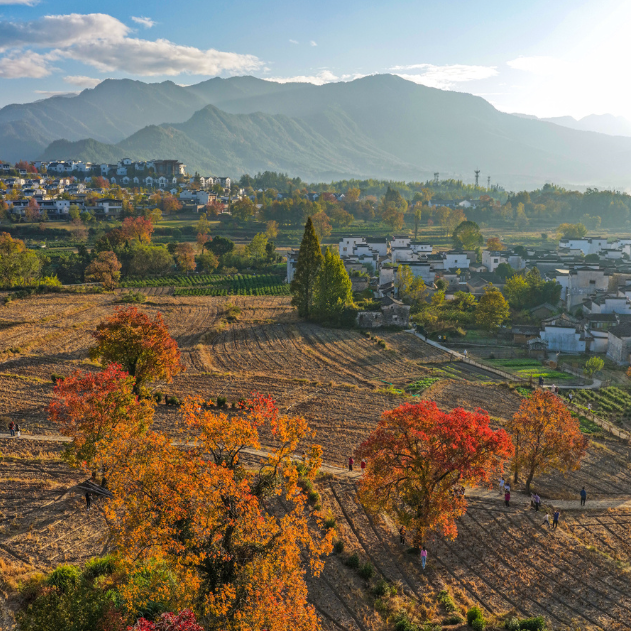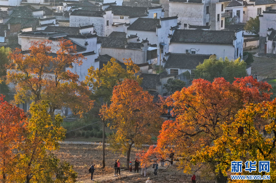 初冬时节,黟县宏村镇卢村晨雾缭绕,色彩绚丽的乌桕树与白墙黛瓦的徽派古村落交相辉映,构成一幅诗意盎然的乡村画卷,吸引众多游客前来观赏。新华网发(施亚磊 摄)