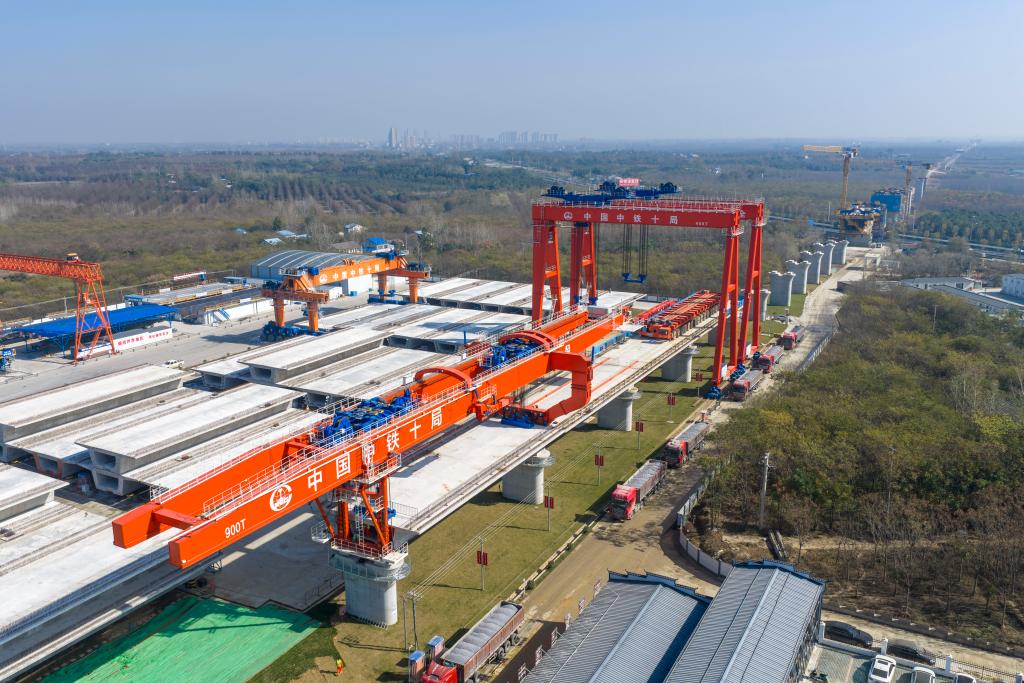 这是合武高铁安徽段站前一标肥西制梁场首榀箱梁架设现场(11月15日,无人机照片)。