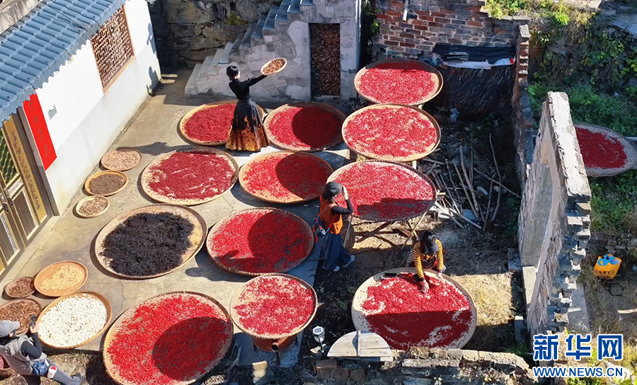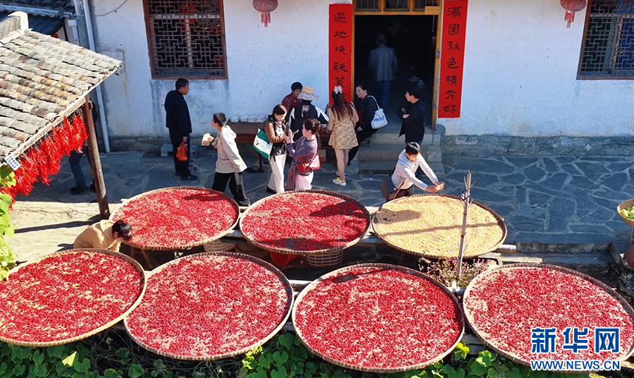 近日,安徽省池州市石台县七都镇画坑村迎来丰收盛景。当地村民在传统晒场上铺满新收的玉米、辣椒等作物,金黄的玉米、火红的辣椒与古朴的白墙黛瓦相映成趣,勾勒出一幅绚丽的乡村丰收画卷。这场独具特色的活动,也吸引了众多游客和摄影爱好者前来打卡、拍照。(王帆 徐丽红 摄)