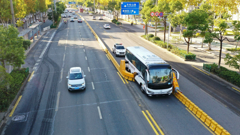 芜湖市长江路(天柱山路-港湾路)段全长约4千米,现状路段为双向6车道。为了进一步提升道路通行的安全性,通过“拉链车”可实现不同方向车道的动态调整,即车道方向更改时由“拉链车”将一侧隔离墩收起放置在另一侧。