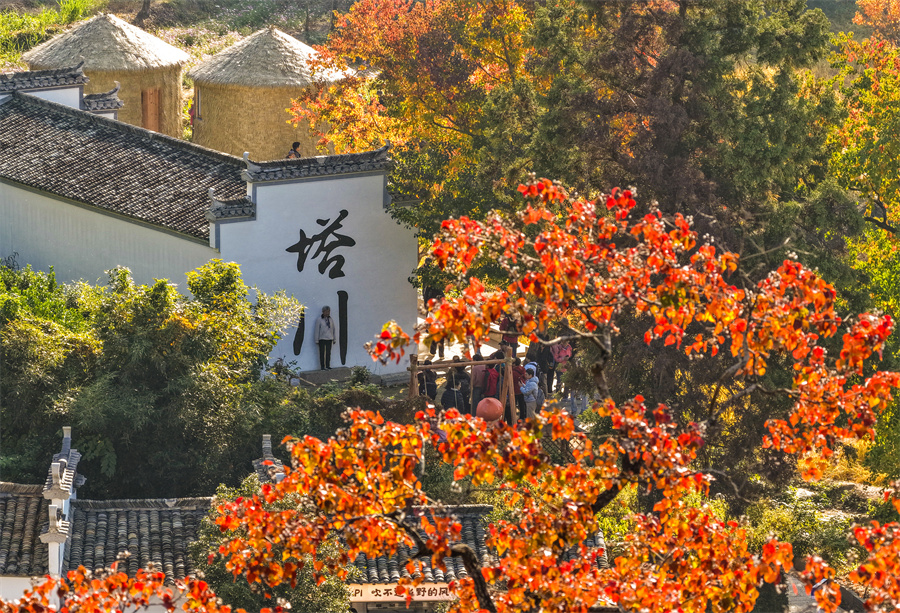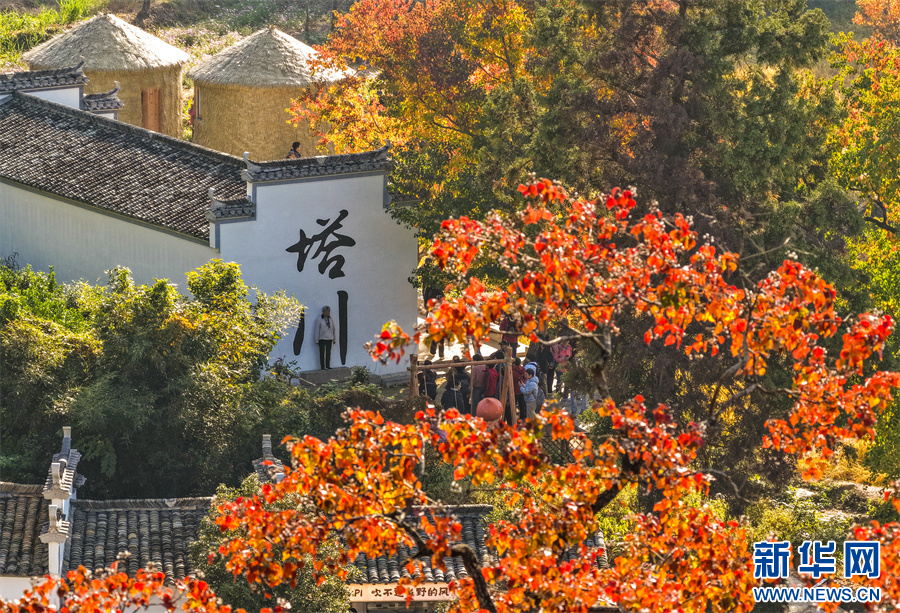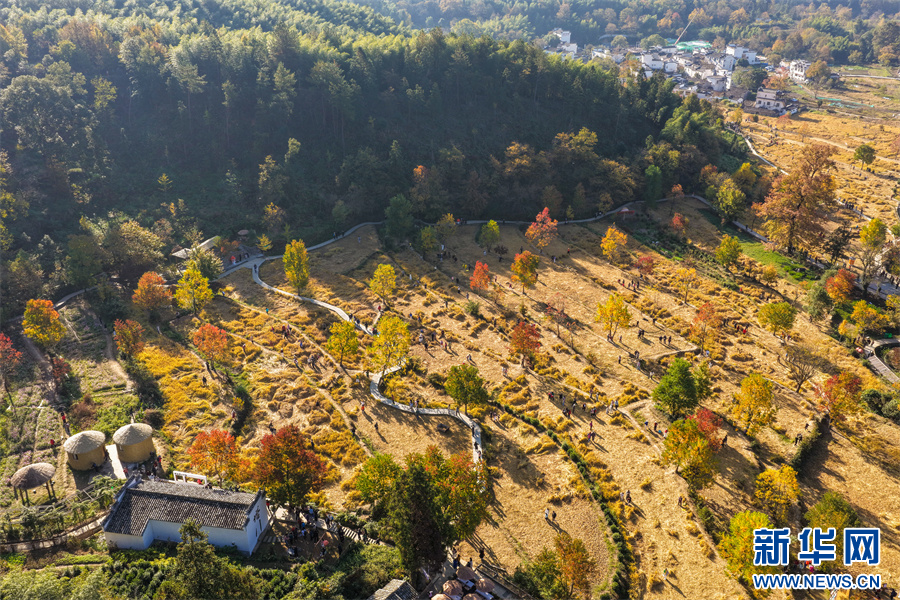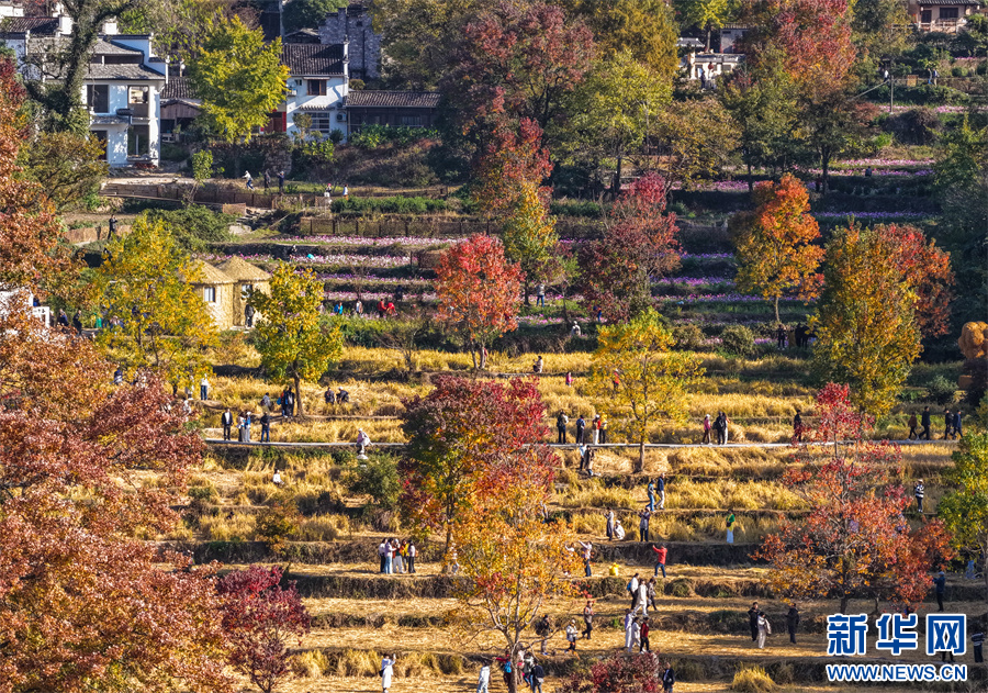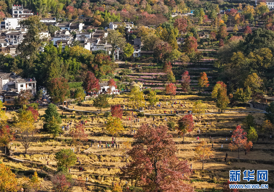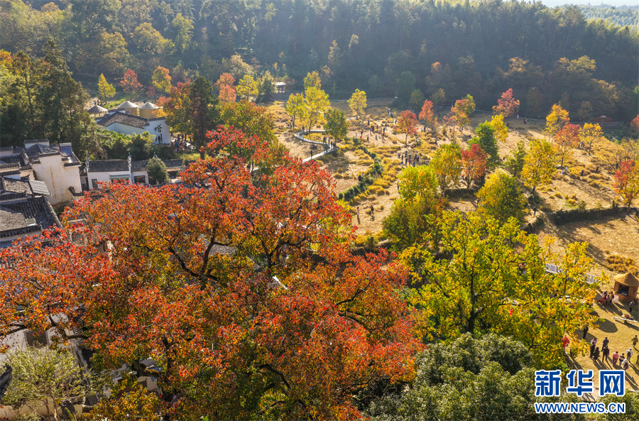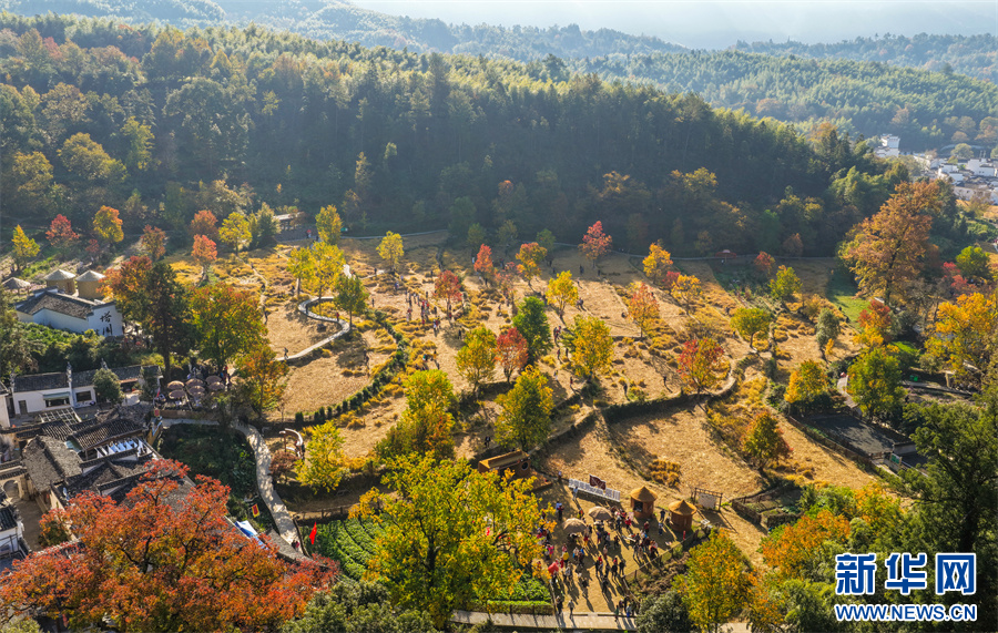 近日,安徽省黄山市黟县宏村镇塔川国家森林公园进入最佳观赏期。层林尽染的树木与粉墙黛瓦的古村落相互映衬,构成一幅诗意盎然的冬日画卷,吸引众多游客前来赏景游览。新华网发(施亚磊 摄)