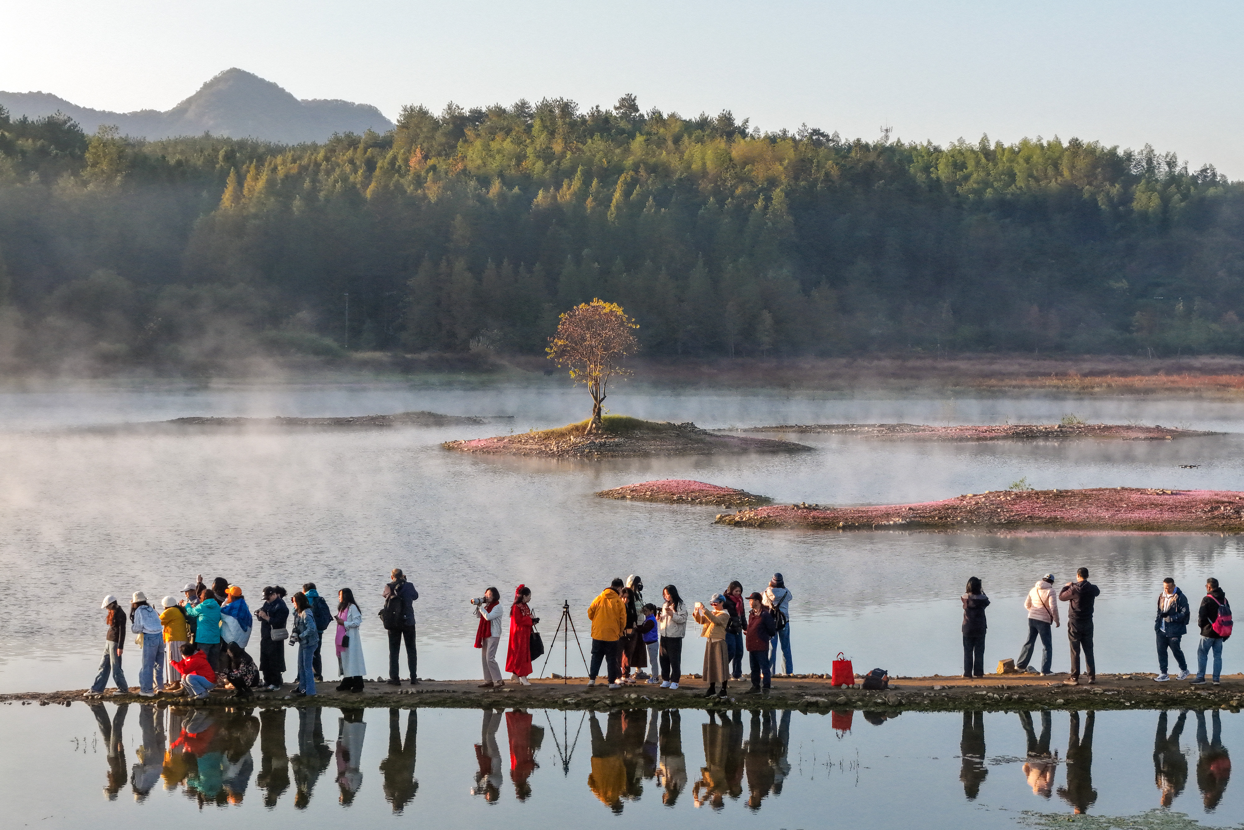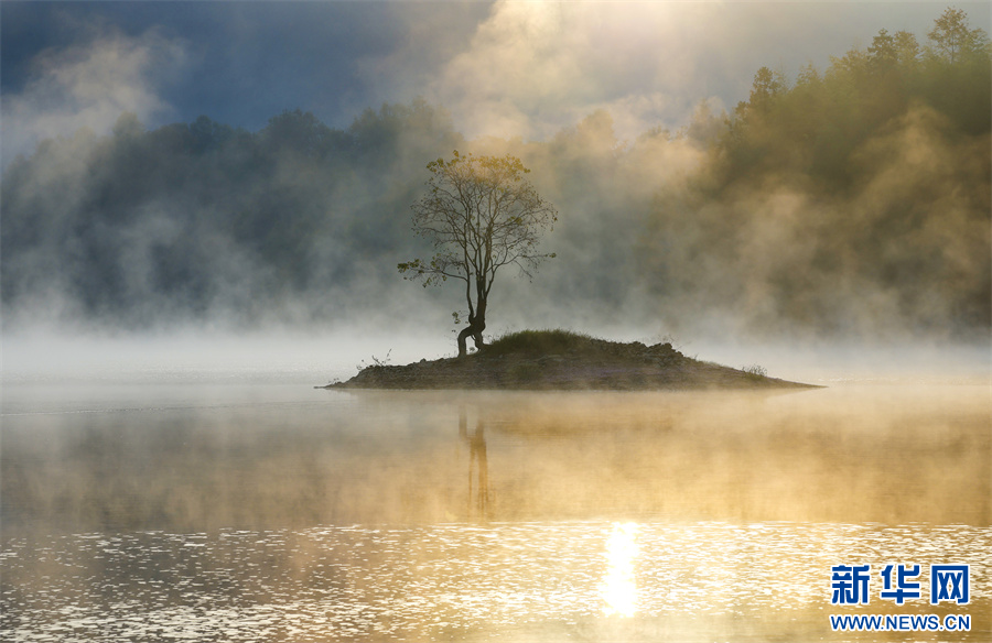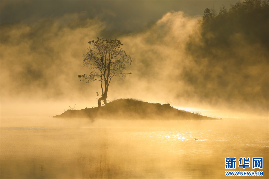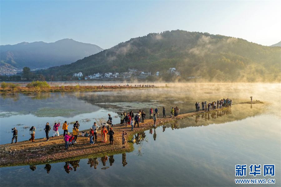 近日,游客在安徽省黄山市黟县宏村镇奇墅湖欣赏晨雾美景。当日,湖面水雾蒸腾,鎏金般的霞光洒在湖面上,熠熠生辉,游客徜徉其间,流连忘返。新华网发(施亚磊 摄)