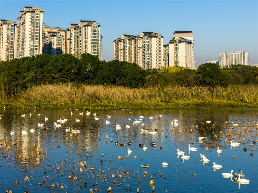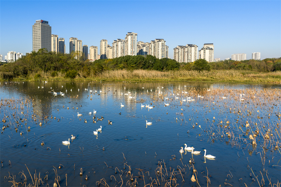11月20日,位于安徽省池州市主城区的月亮湖湿地迎来近300只小天鹅越冬。洁白的身影在湖面翩跹游弋,与城市景观相映成趣,构成一幅和谐生态画卷。