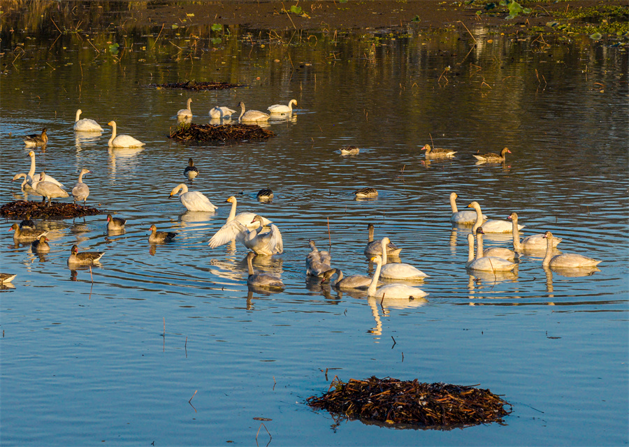 11月20日,安徽省池州市月亮湖湿地迎来小天鹅越冬。