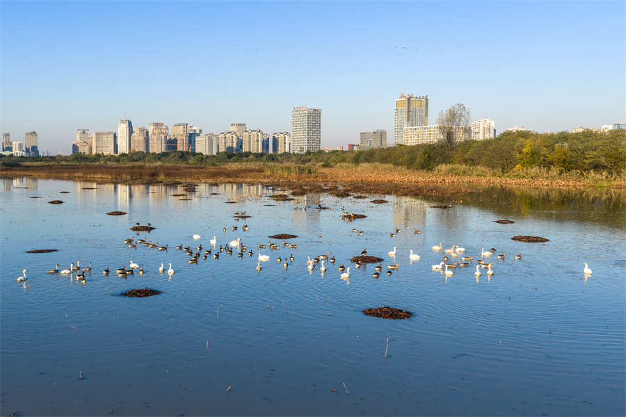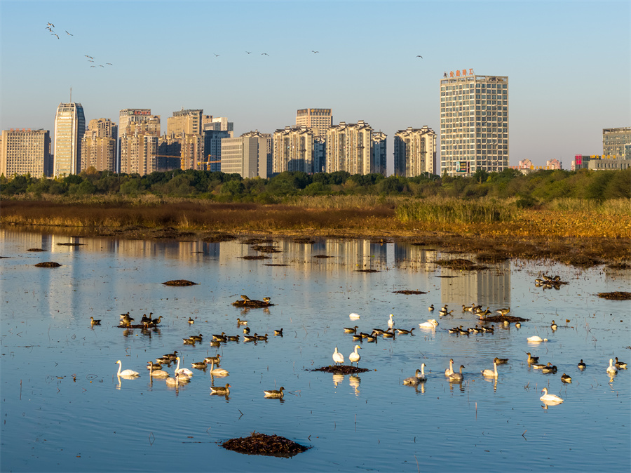 近年来,池州生态环境持续改善,为候鸟栖息提供了良好条件。当地工作人员精心清理栖息地、备足口粮,全力守护这批“冬日贵客”。小天鹅群选择在城市中央安家,不仅成为池州一张鲜活的生态名片,也生动诠释了人与自然和谐共处之美。新华网发(饶治国 摄)