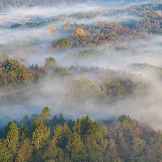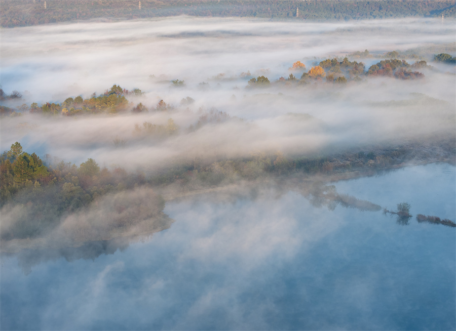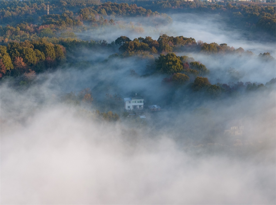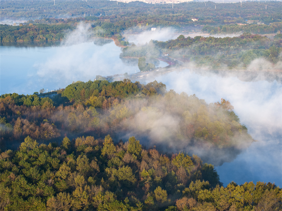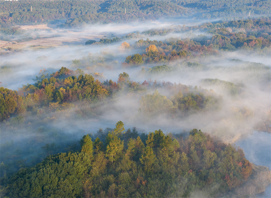 11月20日,池州市晨雾弥漫,山林五彩斑斓,绚丽多姿。