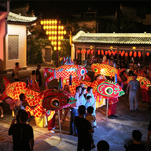 图为10月1日晚,在安徽省黄山市黟县秀里古村,游客与鱼灯合影(无人机照片)。(新华社记者杜宇 摄)