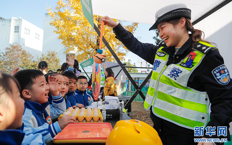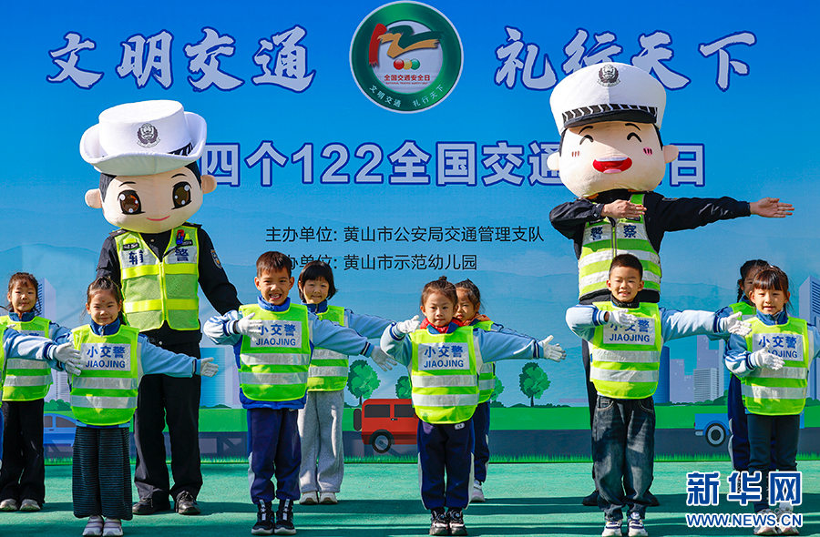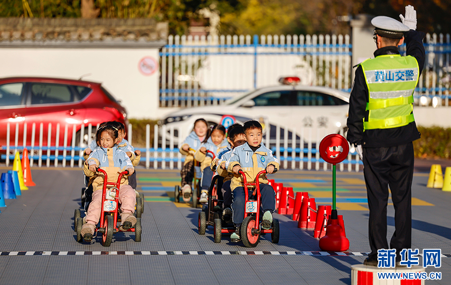 当日,安徽省黄山市公安局交管支队走进校园开展“全国交通安全日”主题活动。孩子们在交警的引导下,亲身体验道路安全驾驶。在一系列沉浸式互动中,将文明出行的种子播撒进童心。新华网发(施亚磊 摄)