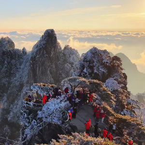 近日,安徽黄山风景区迎来雾凇景观。奇峰古松,银装素裹,宛若琉璃世界,令人流连忘返。(郑慧英)