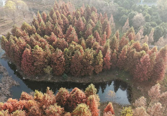 12月8日,位于中垾镇滨湖村的柘皋河湿地公园内,成片红杉由浅黄渐入橙红。林间清脆的鸟鸣与静静流淌的河水相和,共同勾勒出一幅生动盎然的生态画卷。