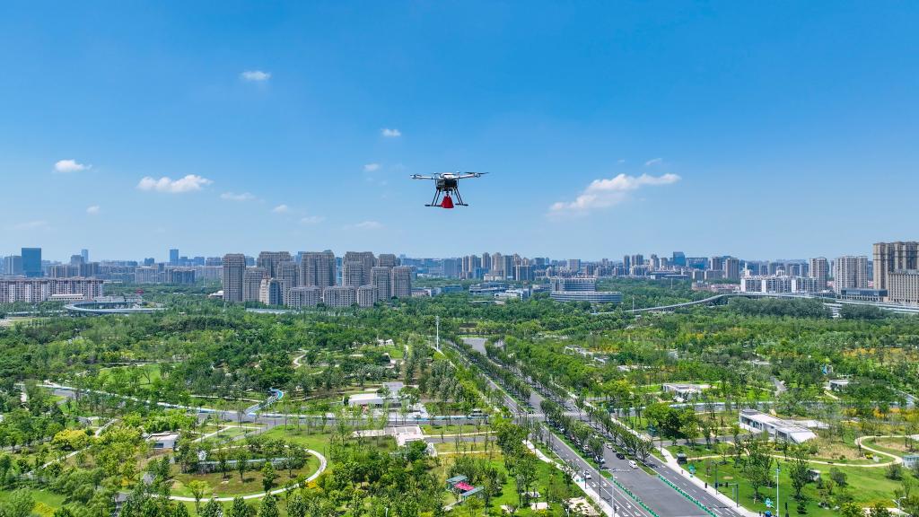 无人机在安徽合肥骆岗公园配送外卖(2024年7月5日摄,无人机照片)。新华社发(罗浩宇 摄)