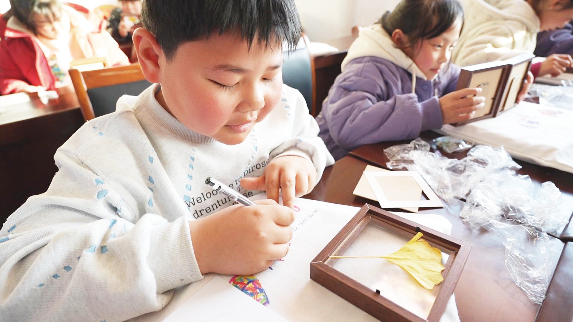 在手工环节,志愿者带领孩子们利用提前收集的陈集镇千年古银杏树的树叶制作创意小摆件。这些凝聚着孩子心意的手工作品,一份由学生自己珍藏,另一份将跨越山海,回赠给远在宁波参与童书漂流的宁波大学附属学校的伙伴们。“我做了银杏叶小摆件,上面写了祝福语。希望宁波的小朋友收到后会喜欢这份礼物。”怀远县陈集镇水利希望小学三年级学生张诺言说。