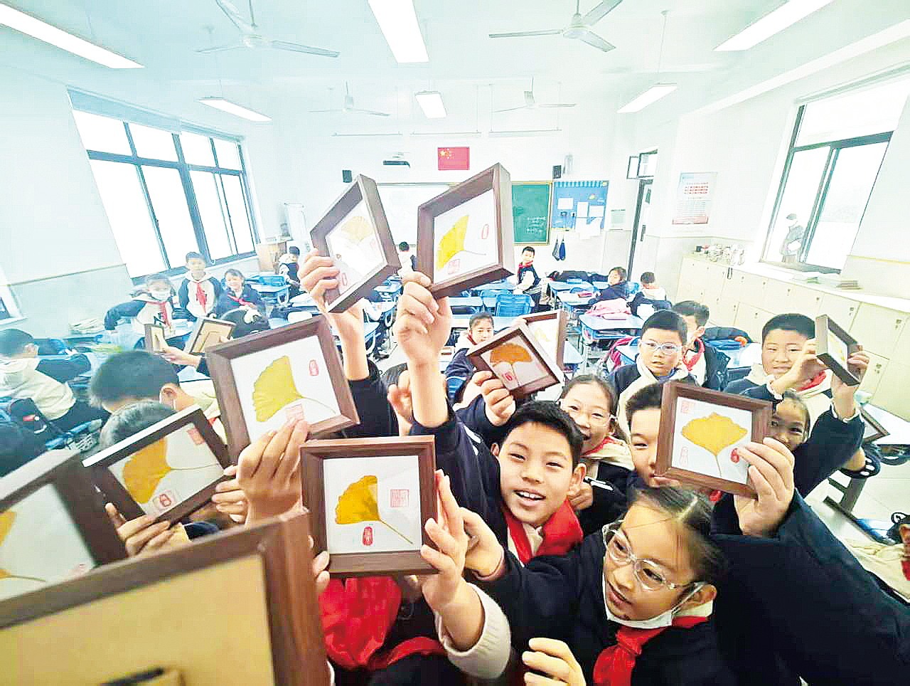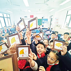 宁波大学附属学校311班的孩子们展示收到的银杏叶画框。