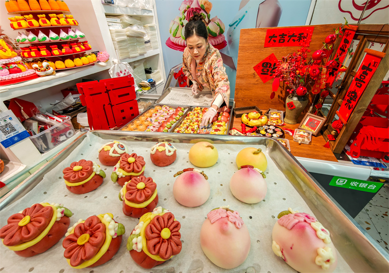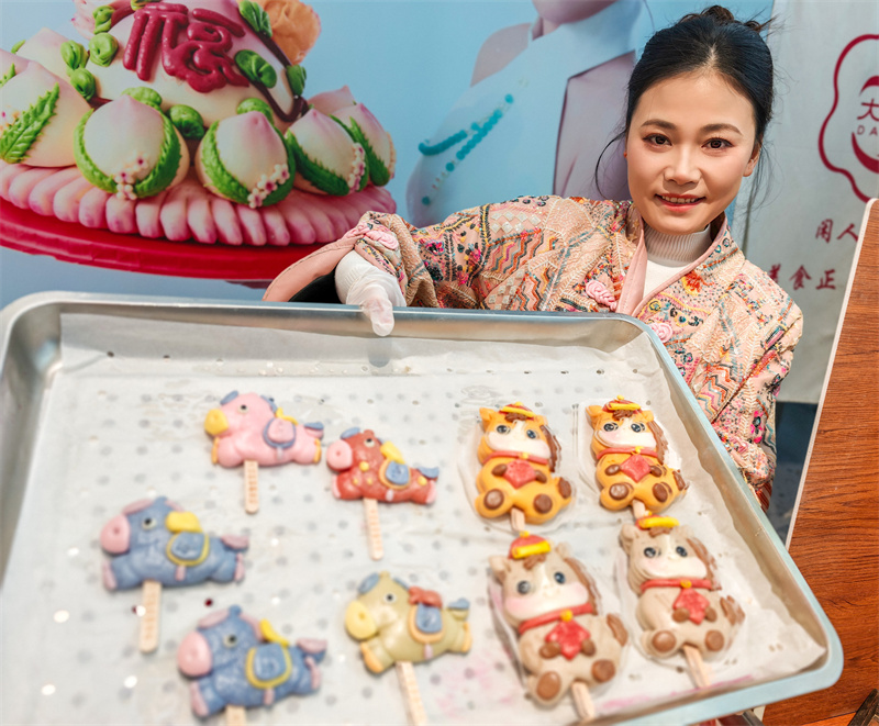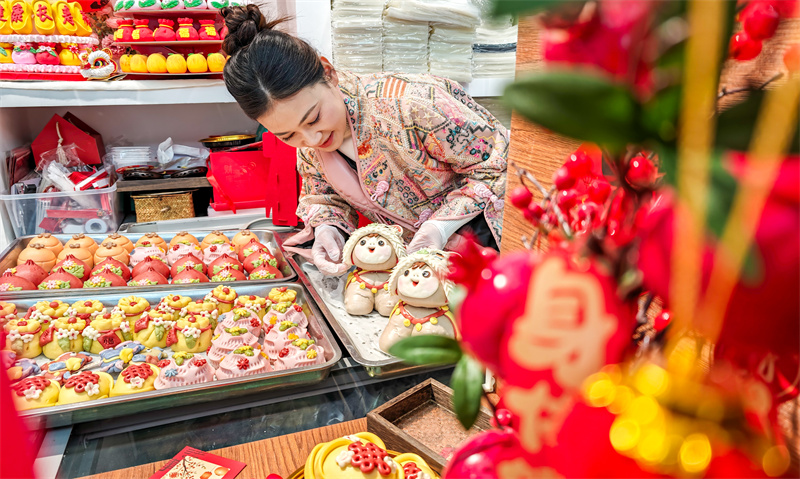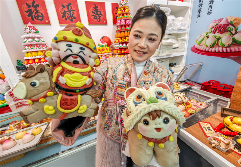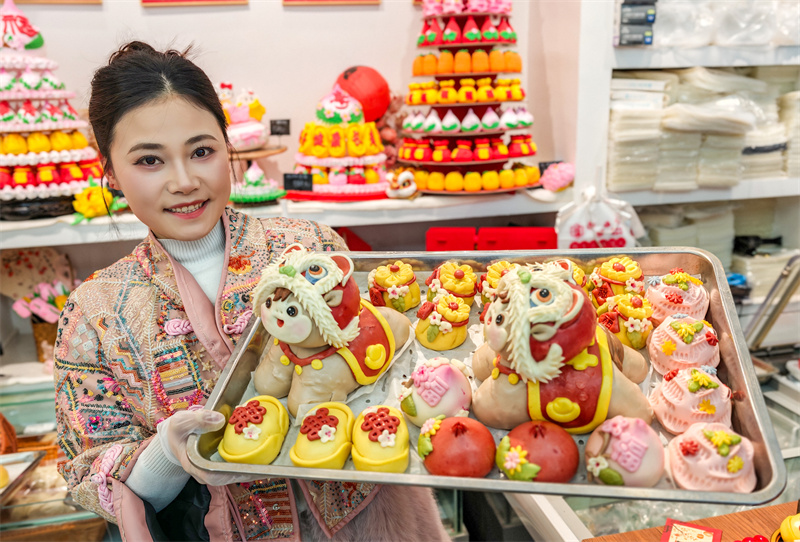 1月12日,安徽省淮北市濉溪县花馍非遗传承人郭钰赶制含有春节元素的花馍,惟妙惟肖的“生肖马、福袋、金元宝”等花馍热销市场,受到消费者喜爱。新华网发(王文 张明菊 摄)
