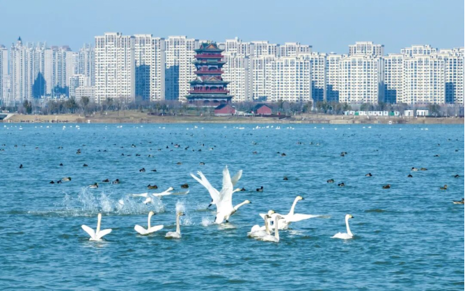在明湖公园,成群的天鹅和斑嘴鸭、绿头鸭以及凤头鸊鷉在湖面觅食、嬉戏。刘肖文 摄