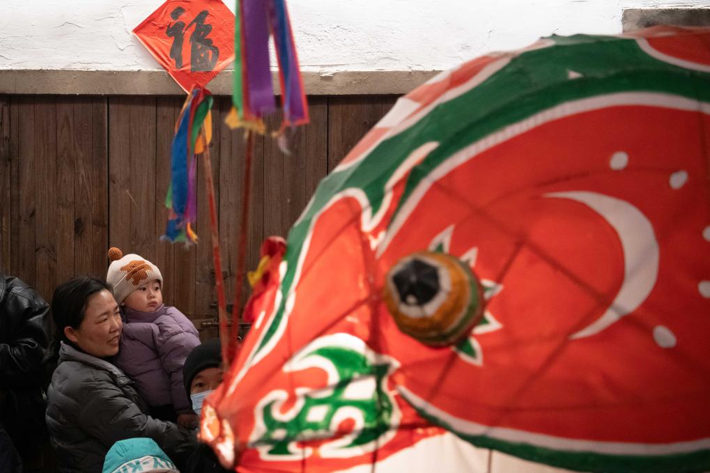 2025年1月10日,在安徽省黄山市歙县北岸镇瞻淇村,家长抱着孩子在观看鱼灯巡游。
