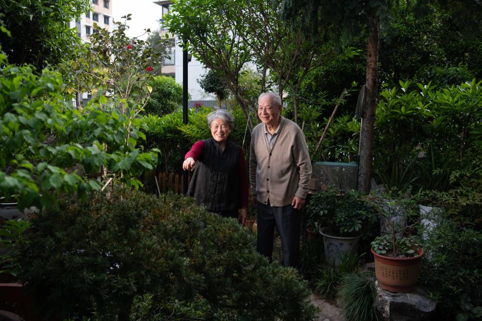 2025年4月10日,在安徽省黄山市屯溪区的家中小院里,徽州古建筑专家程极悦(右)与妻子童建英交流。
