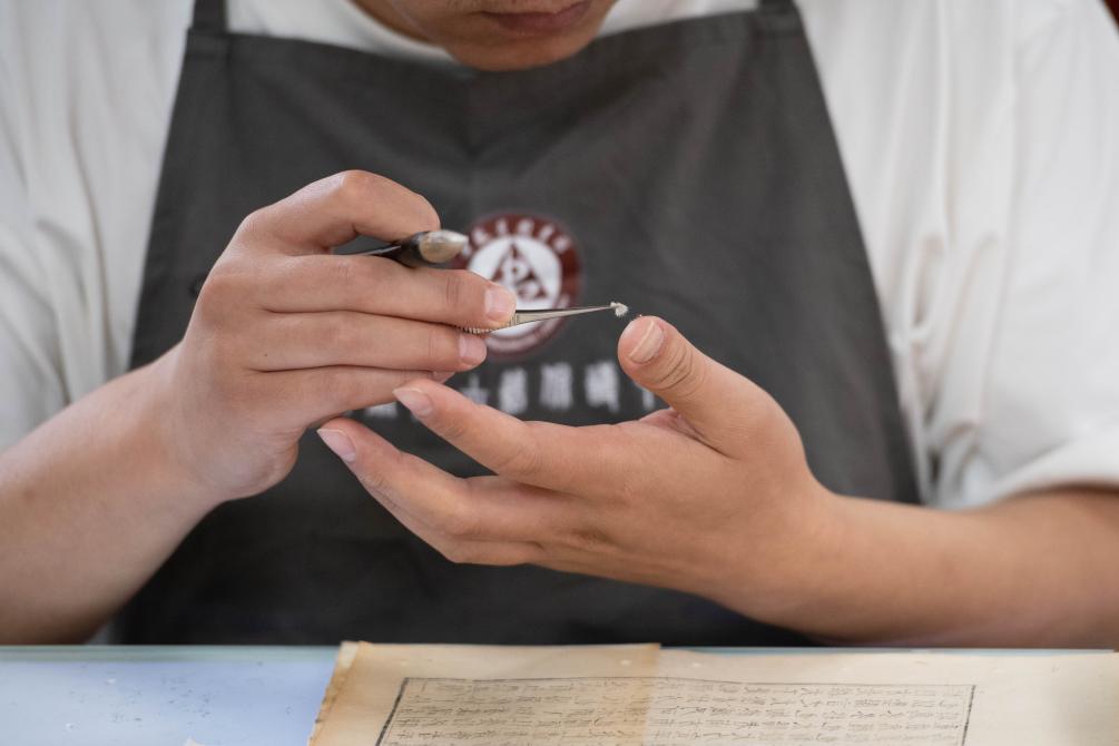 2025年6月24日,古籍修复师金鑫在拼碎片。