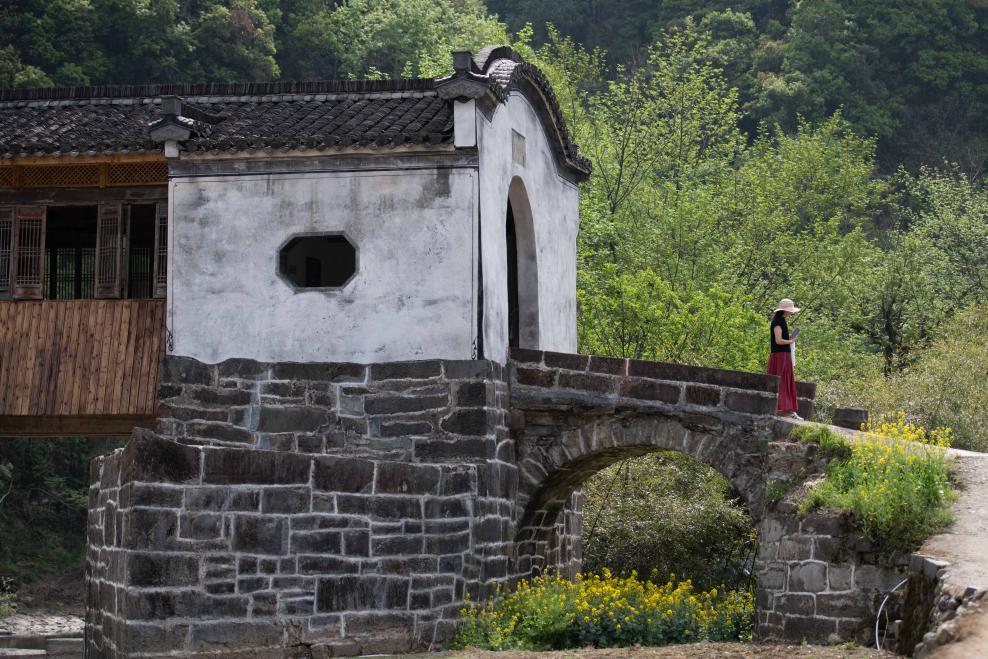2025年4月11日,在安徽省黄山市休宁县的拱北廊桥,游客参观结束后准备离开。