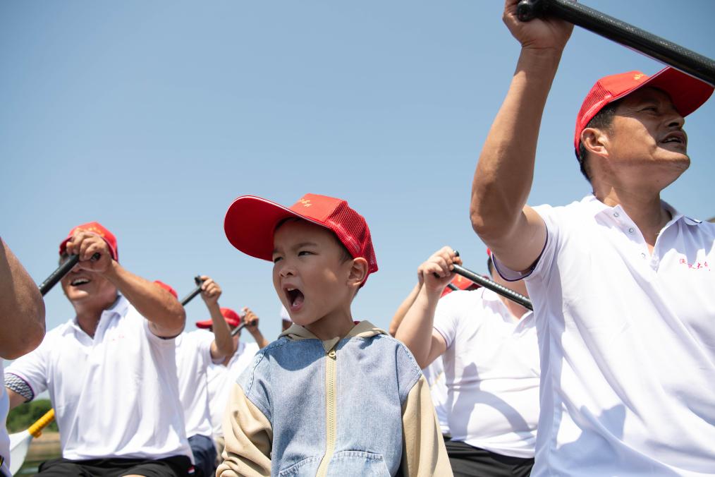2025年5月29日,在安徽省宣城市泾县桃花潭镇,翟少宇小朋友(中)在喊龙舟号子。