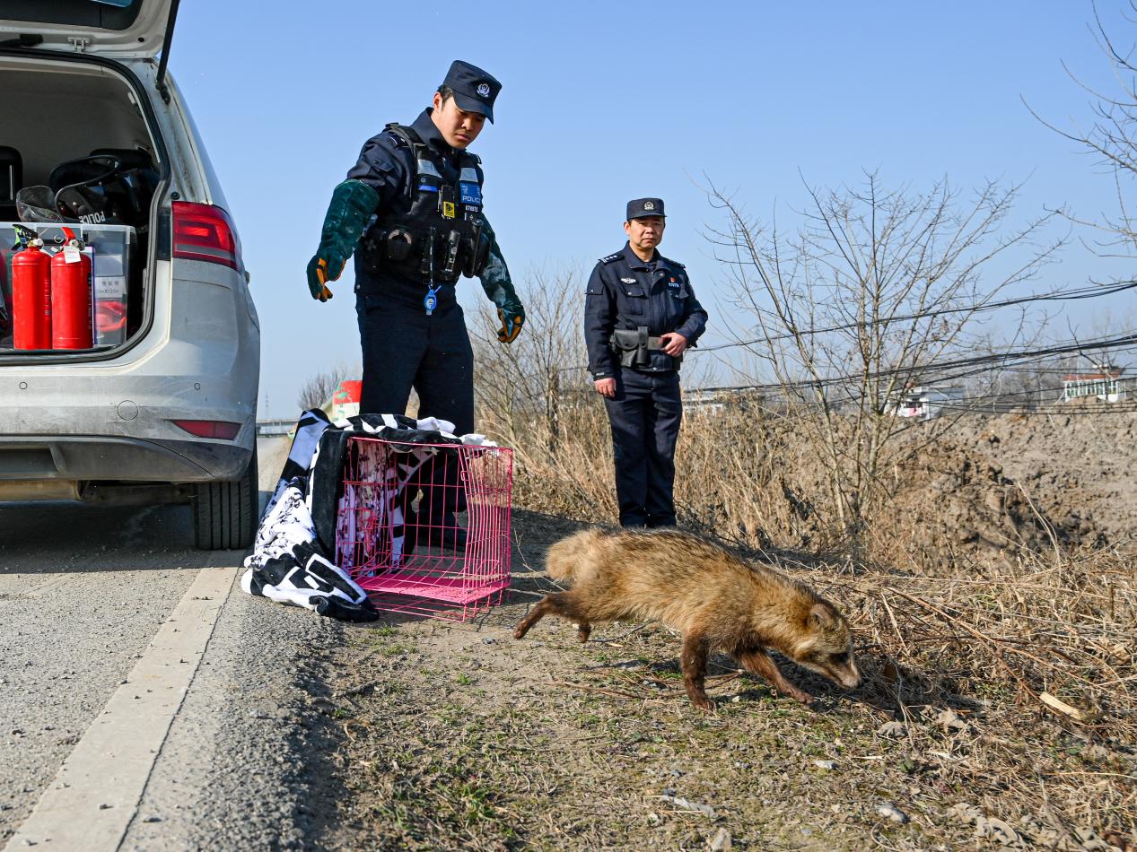 1月13日,马鞍山市和县公安局接到群众报警,称在野外发现一只野生动物被防护网缠绕困住。民警迅速抵达现场,确认受困动物为国家二级保护野生动物——貉。民警当即小心剪除其周身绳索,经细致检查确认无外伤后,将这只貉带至适宜栖息地成功放归自然,并向围观的村民现场普法。
