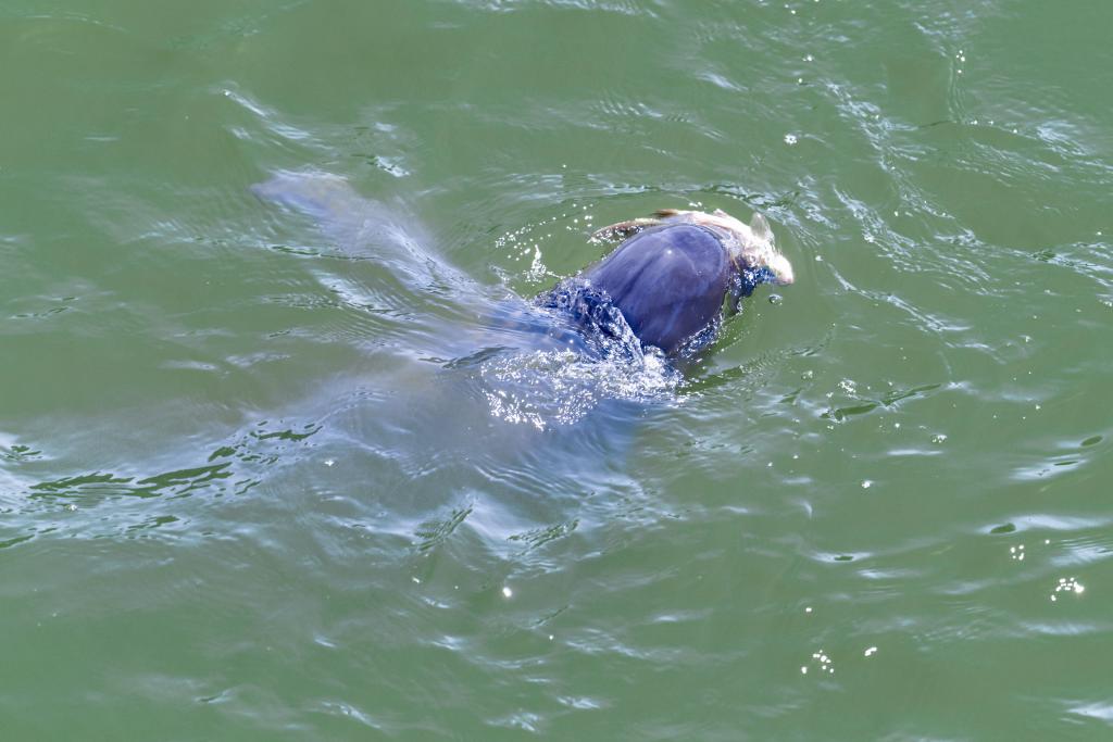 2023年7月23日,安徽省铜陵淡水豚国家级自然保护区内,一只江豚正在水中捕鱼,畅快享受进食时光。(储著传 摄)