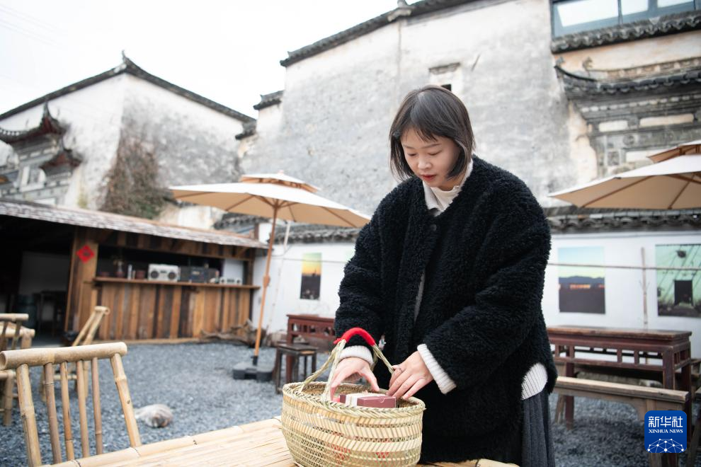 2月7日,在安徽省黄山市黟县碧山村,商户打包客人购买的特色年货。